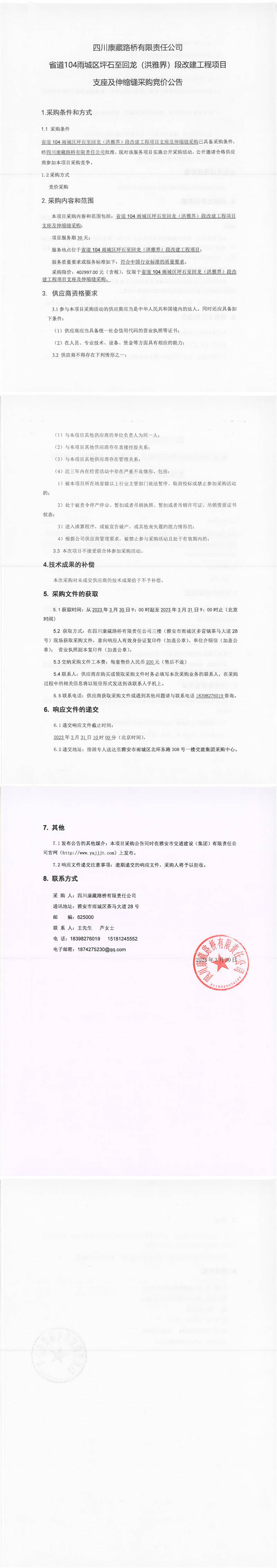 四川康藏路橋有限責(zé)任公司省道104雨城區(qū)坪石至回龍(洪雅界)段改建工程項目支座及伸縮縫采購競價公告