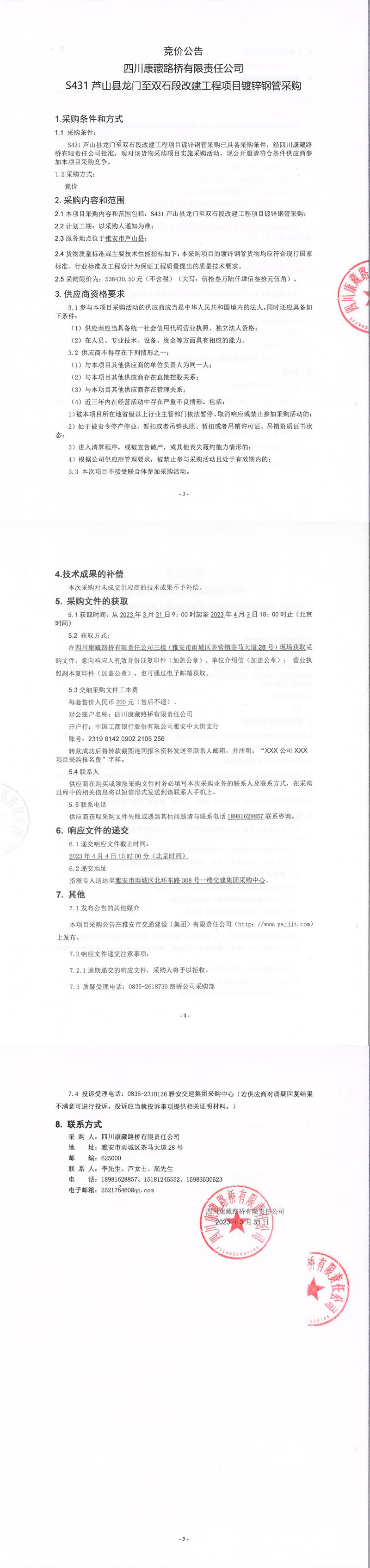 四川康藏路橋有限責(zé)任公司S431蘆山縣龍門至雙石段改建工程項(xiàng)目鍍鋅鋼管采購(gòu)競(jìng)價(jià)公告