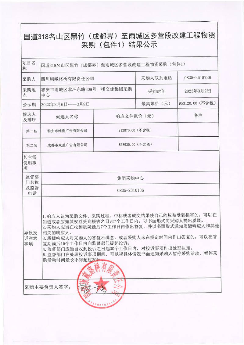 四川康藏路橋有限責(zé)任公司國道318名山區(qū)黑竹(成都界)至雨城區(qū)多營段改建工程物資采購(包件1)結(jié)果公示