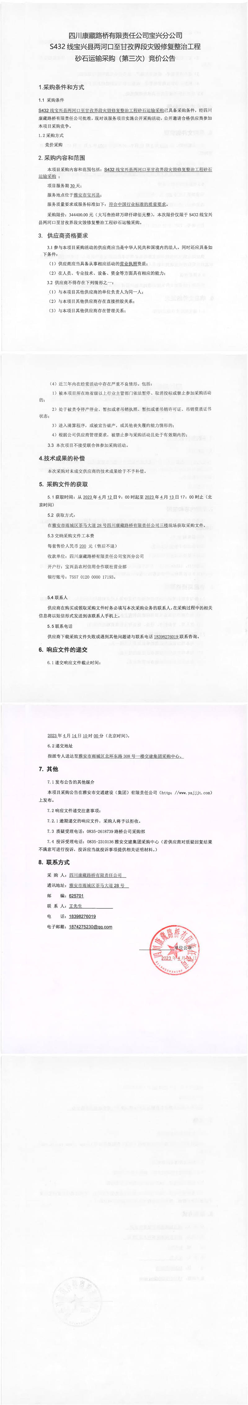 四川康藏路橋有限責(zé)任公司寶興分公司S432寶興縣兩河口至甘孜界段災(zāi)毀修復(fù)整治工程砂石運輸采購(第三次)競價公告