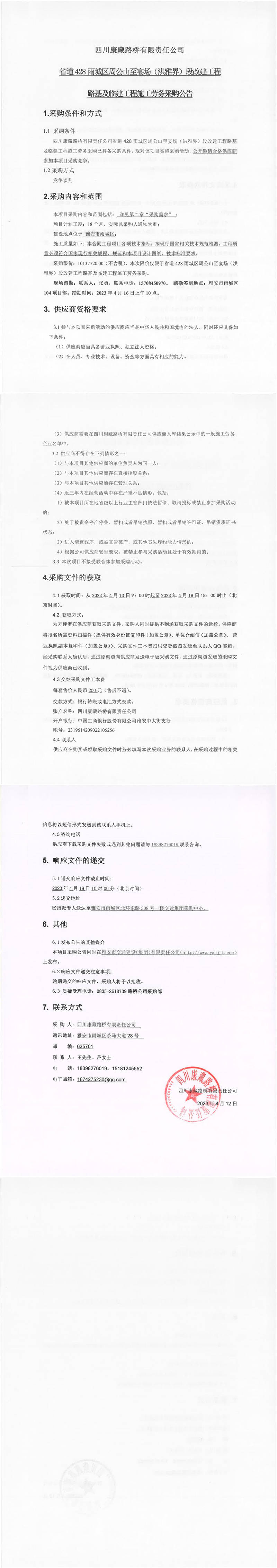 四川康藏路橋有限責任公司省道428雨城區(qū)周公山至宴場(洪雅界)段改建工程路基及臨建工程施工勞務采購公告