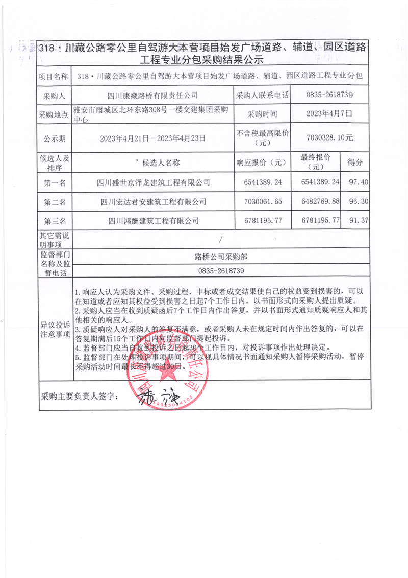 四川康藏路橋有限責(zé)任公司318·川藏公路零公里自駕游大本營項目始發(fā)廣場道路、輔道、園區(qū)道路工程專業(yè)分包采購結(jié)果公示