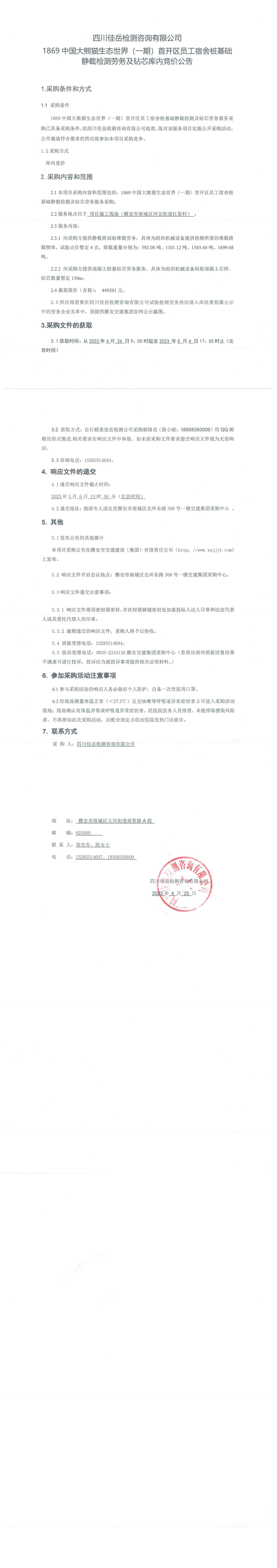 四川佳岳檢測(cè)咨詢有限公司1869中國大熊貓生態(tài)世界(一期)首開區(qū)員工宿舍樁基礎(chǔ)靜載檢測(cè)勞務(wù)及磚芯庫內(nèi)競(jìng)價(jià)公告