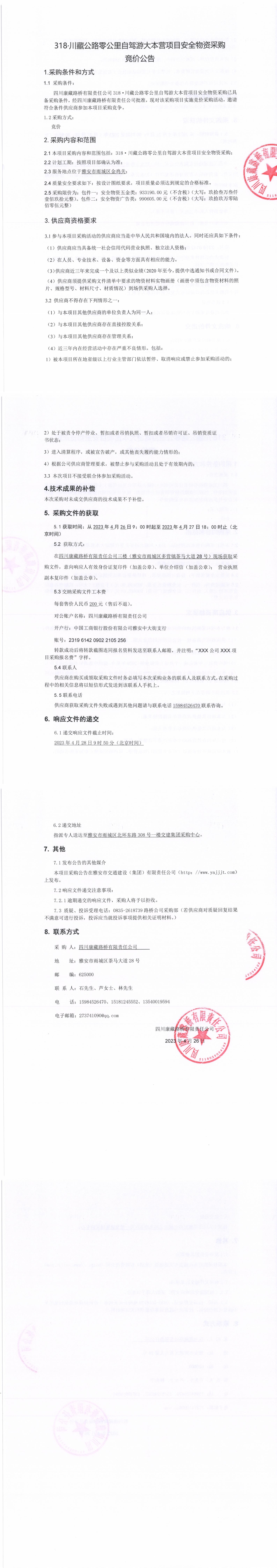 四川康藏路橋有限責(zé)任公司318·川藏公路零公里自駕游大本營(yíng)項(xiàng)目安全物資采購(gòu)競(jìng)價(jià)公告