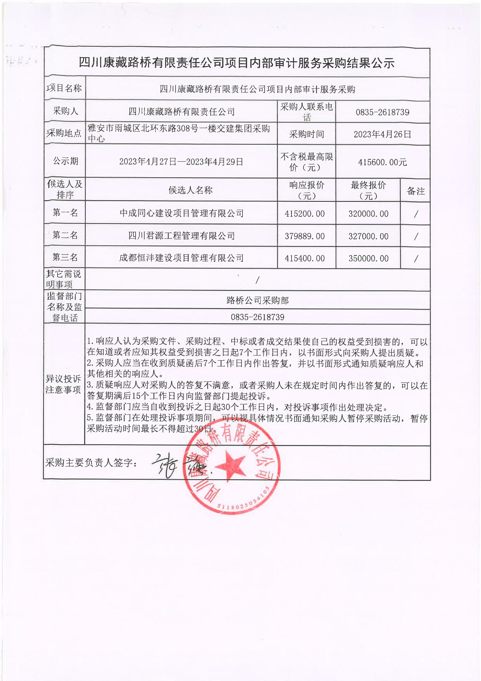 四川康藏路橋有限責任公司項目內(nèi)部審計服務采購結果公示