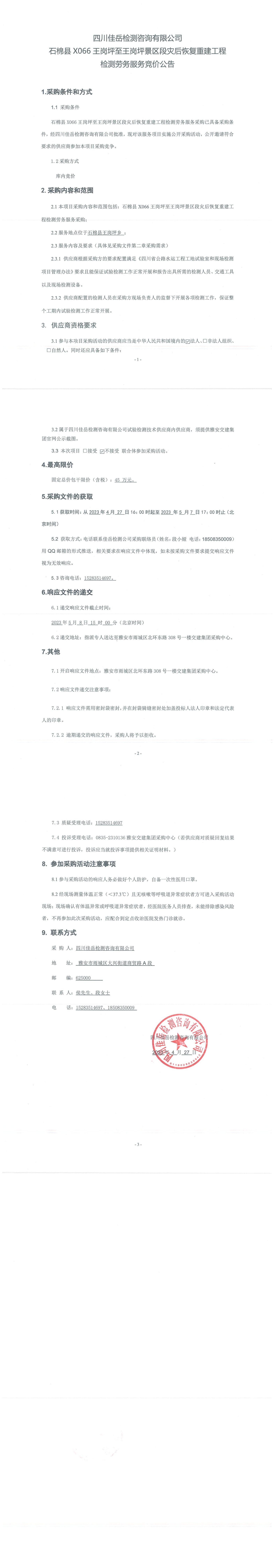 四川佳岳檢測咨詢有限公司石棉縣X066王崗坪至王崗坪景區(qū)段災后恢復重建工程檢測勞務服務競價公告