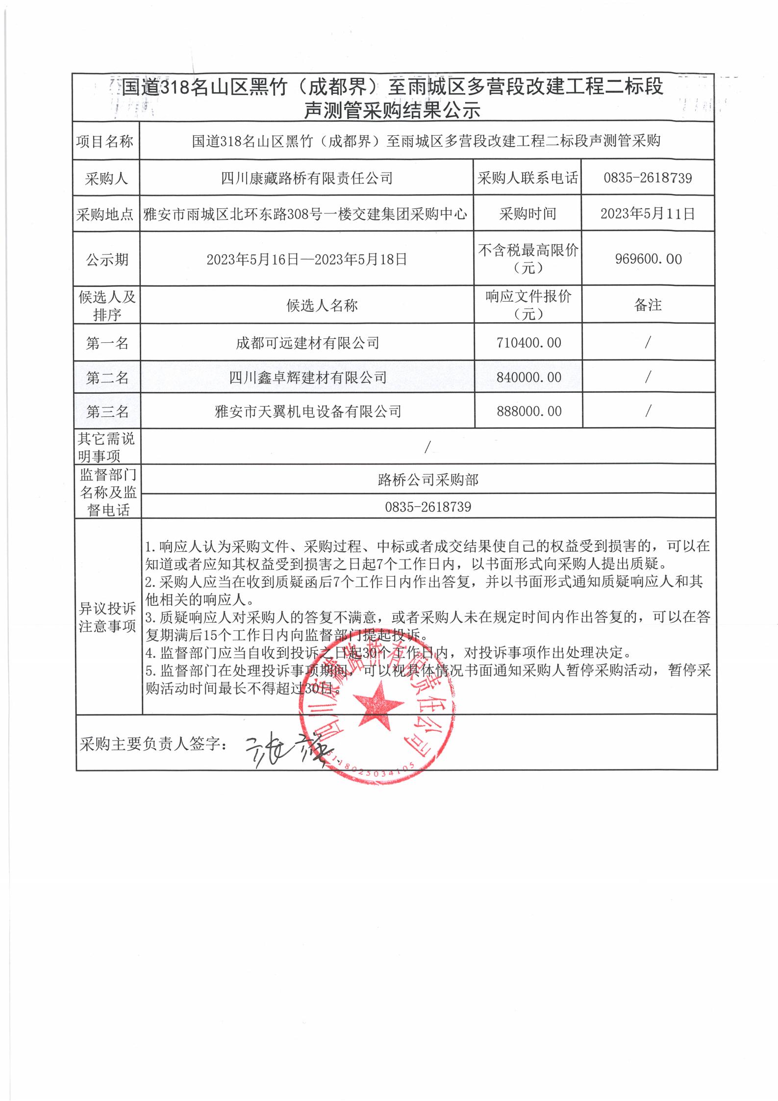 四川康藏路橋有限責(zé)任公司國道318名山區(qū)黑竹(成都界)至雨城區(qū)多營段改建工程二標(biāo)段聲測管采購結(jié)果公示