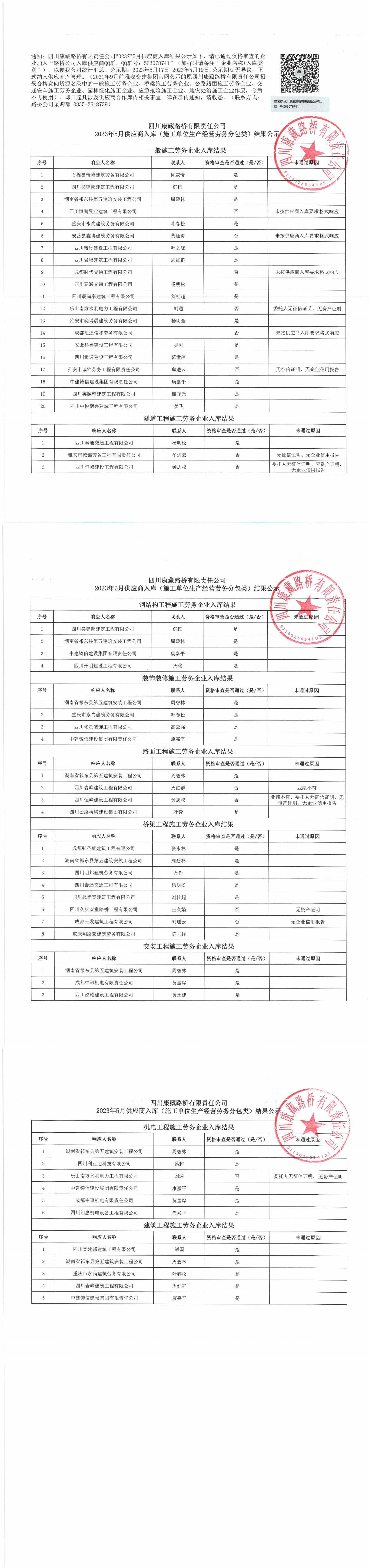 四川康藏路橋有限責(zé)任公司2023年5月供應(yīng)商入庫(kù)(施工單位生產(chǎn)經(jīng)營(yíng)勞務(wù)分包類(lèi))結(jié)果公示