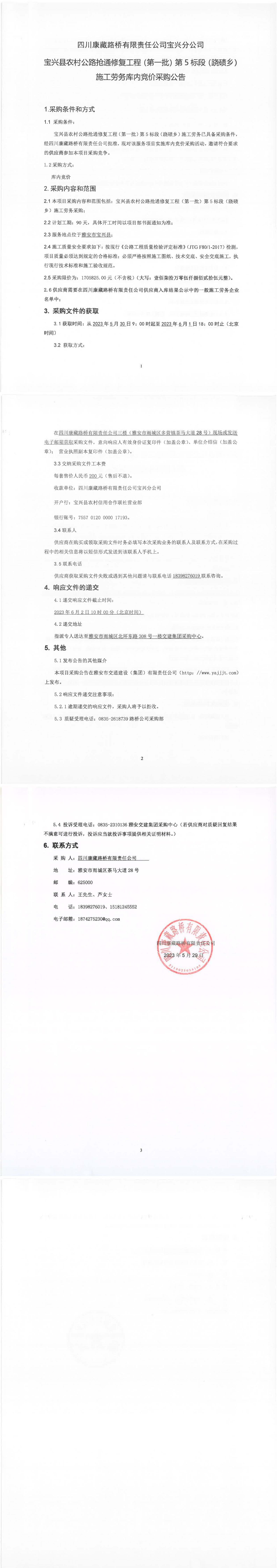 四川康藏路橋有限責(zé)任公司寶興農(nóng)村公路搶通修復(fù)工程(第一批)第5標(biāo)段(蹺磧鄉(xiāng))施工勞務(wù)庫(kù)內(nèi)競(jìng)價(jià)采購(gòu)公告