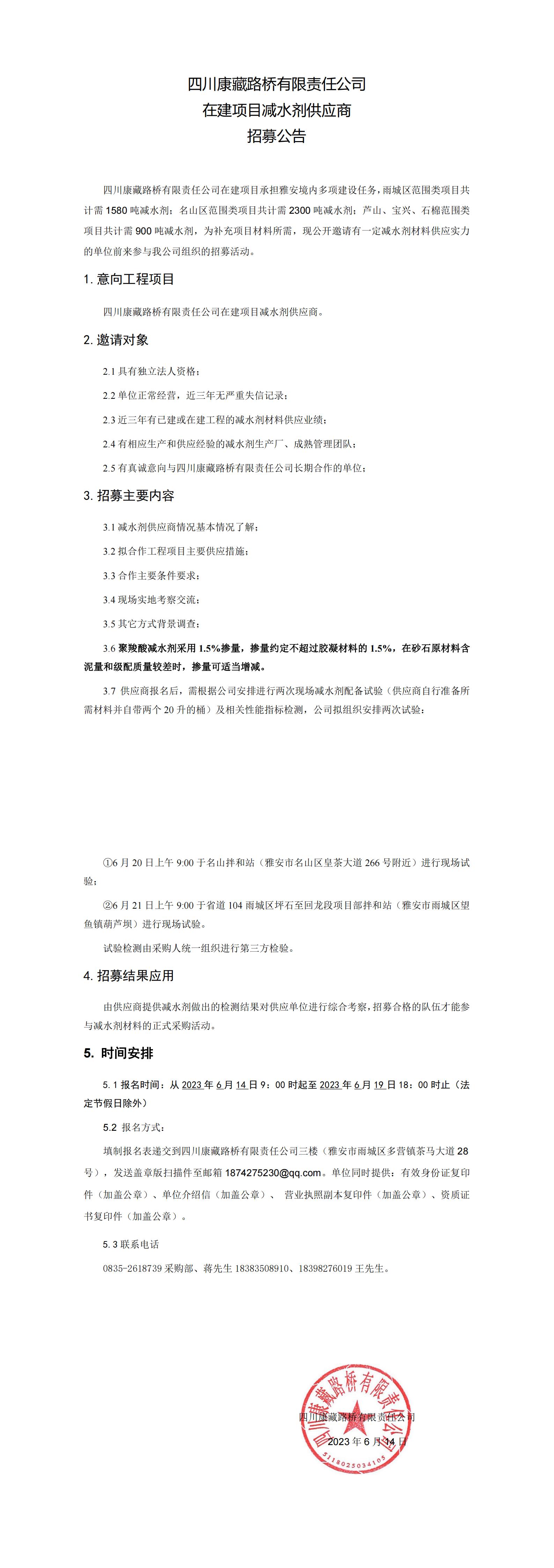 四川康藏路橋有限責任公司在建項目減水劑供應商招募公告