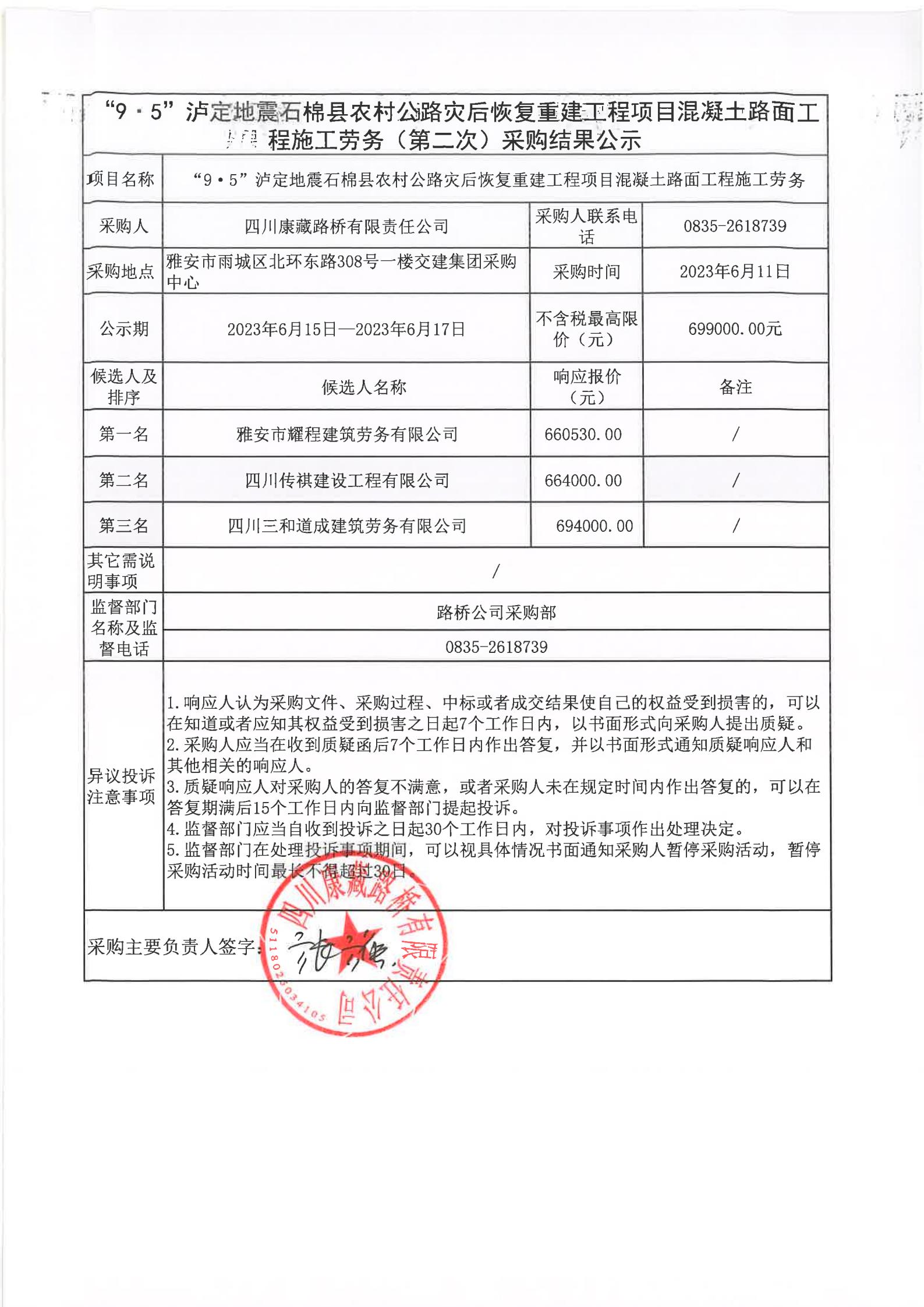 四川康藏路橋有限責任公司“9·5”瀘定地震石棉縣農(nóng)村公路災后恢復重建工程項目混凝土路面工程施工勞務(wù)采購(第二次)結(jié)果公示