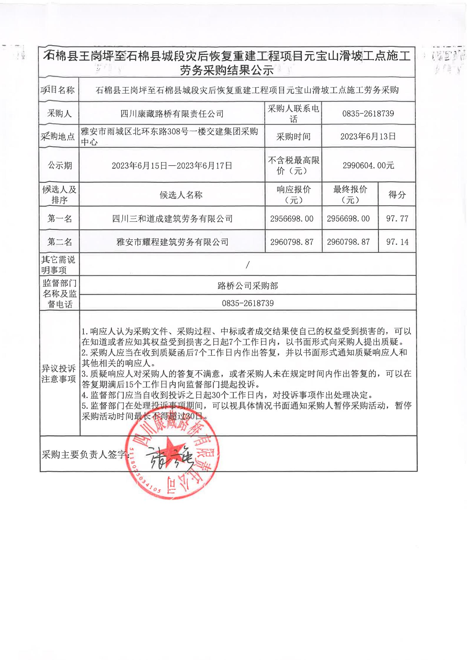 四川康藏路橋有限責(zé)任公司石棉縣王崗坪至石棉縣城段災(zāi)后恢復(fù)重建工程項(xiàng)目元寶山滑坡工點(diǎn)施工勞務(wù)采購結(jié)果公示