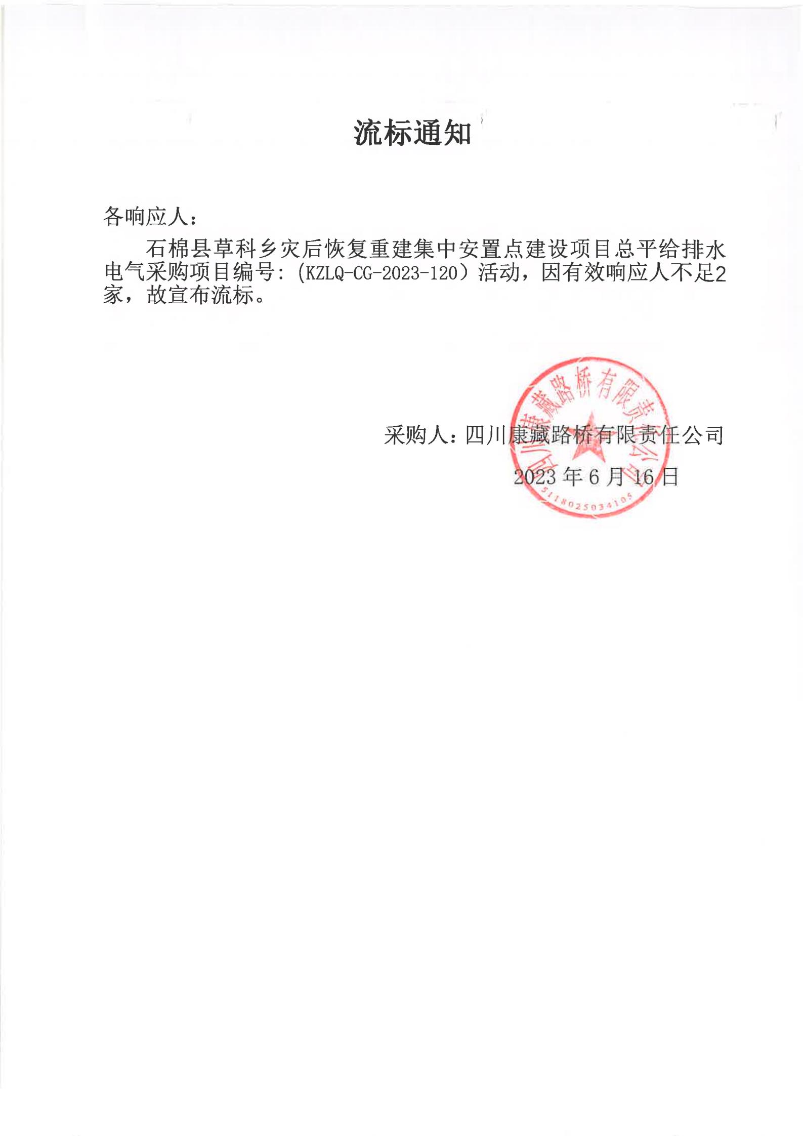 四川康藏路橋有限責(zé)任公司石棉縣草科鄉(xiāng)災(zāi)后恢復(fù)重建集中安置點(diǎn)建設(shè)項(xiàng)目總平給排水電氣采購(gòu)流標(biāo)通知