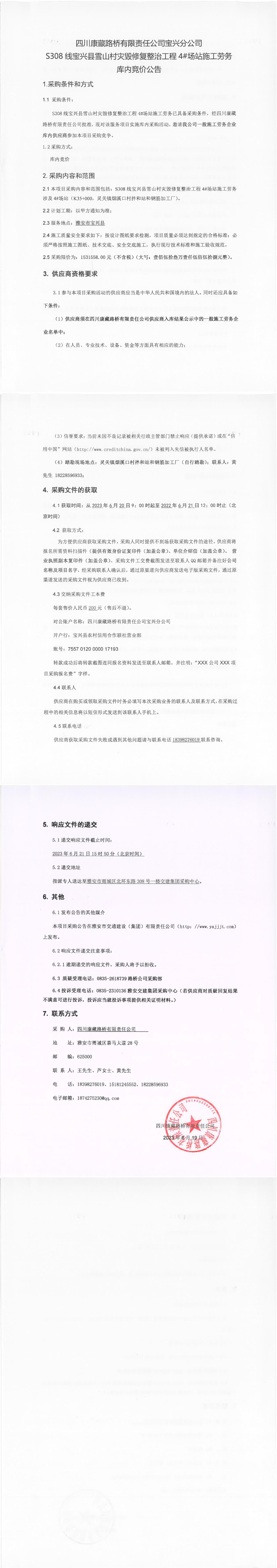 四川康藏路橋有限責(zé)任公司寶興分公司S308線寶興縣雪山村災(zāi)毀整治工程4#場(chǎng)站施工勞務(wù)庫(kù)內(nèi)競(jìng)價(jià)公告