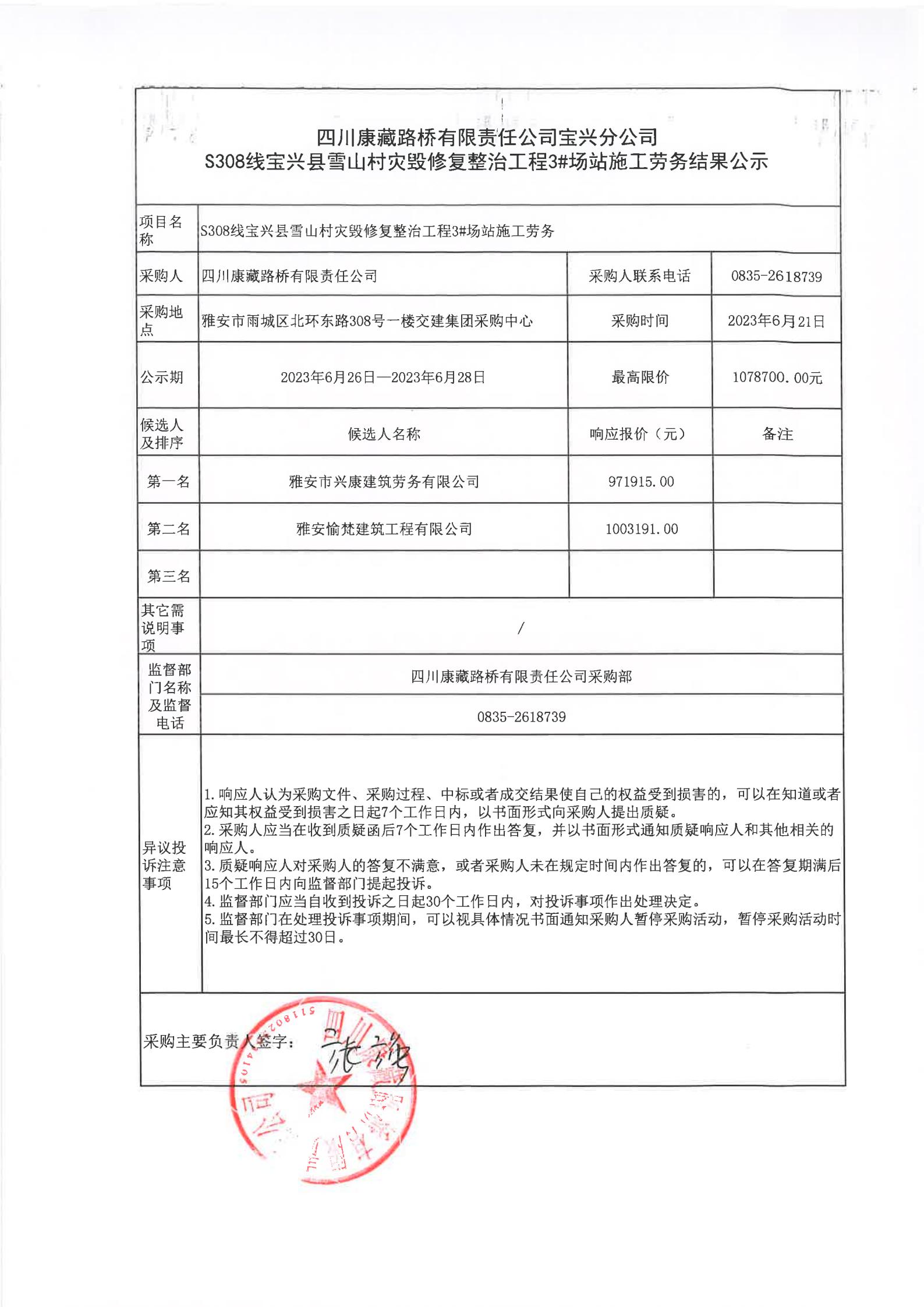 四川康藏路橋有限責任公司寶興分公司S308線寶興縣雪山村段災毀修復整治工程3#場站施工勞務結果公示