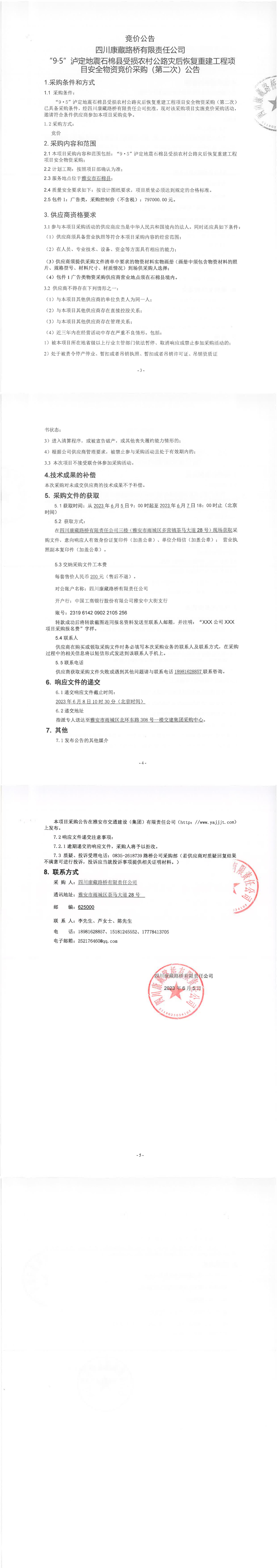 四川康藏路橋有限責任公司“9·5”瀘定地震石棉縣受損農村公路災后恢復重建工程項目安全物資競價采購(第二次)公告