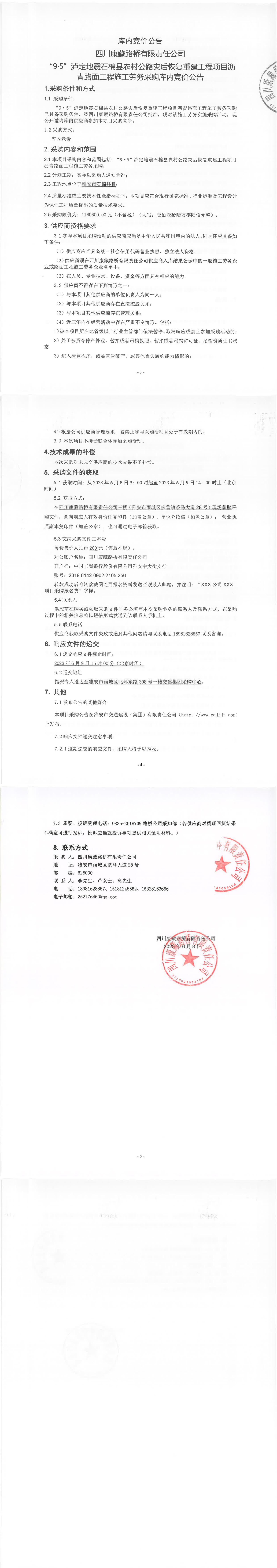 四川康藏路橋有限責(zé)任公司“9·5”瀘定地震石棉縣農(nóng)村公路災(zāi)后恢復(fù)重建工程項(xiàng)目混凝土路面工程施工勞務(wù)采購(gòu)庫(kù)內(nèi)競(jìng)價(jià)公告