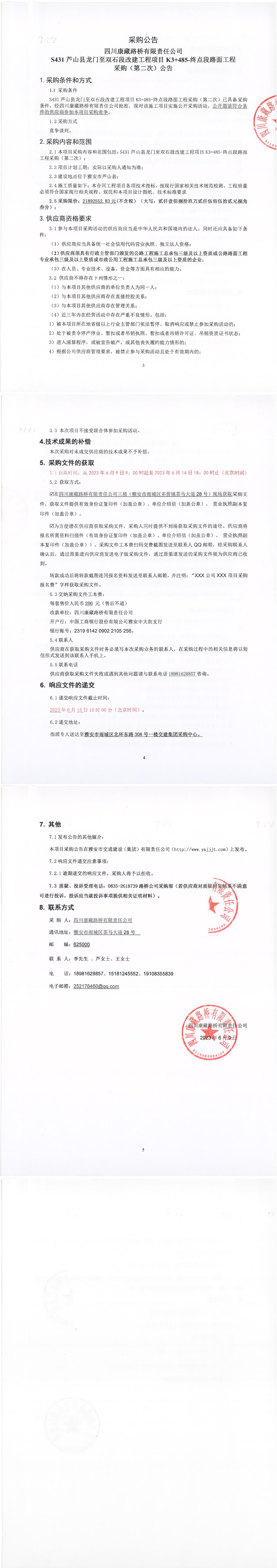 四川康藏路橋有限責(zé)任公司S431蘆山縣龍門(mén)至雙石段改建工程項(xiàng)目K3+485-終點(diǎn)段路面工程采購(gòu)(第二次)公告