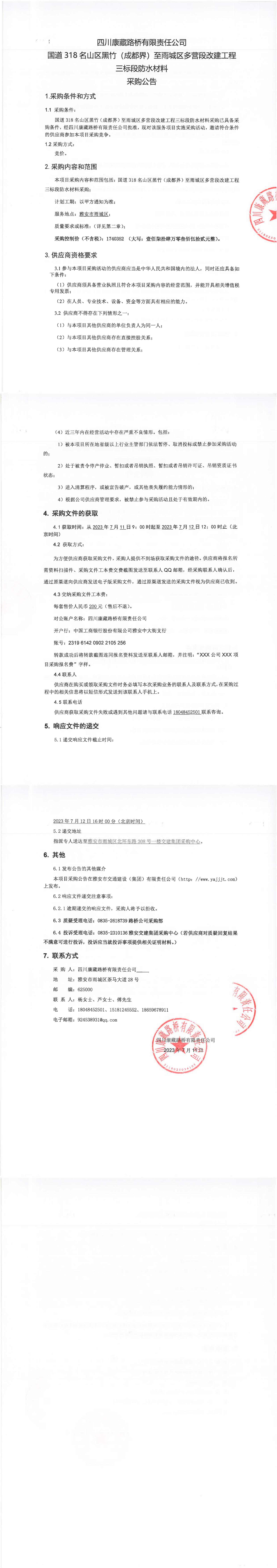 四川康藏路橋有限責(zé)任公司國道318名山區(qū)黑竹(成都界)至雨城區(qū)多營段改建工程三標段防水材料采購公告