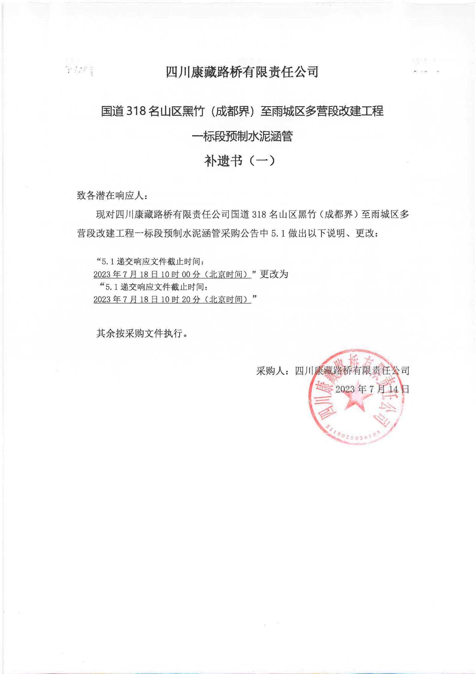 四川康藏路橋有限責(zé)任公司國(guó)道318名山區(qū)黑竹(成都界)至雨城區(qū)多營(yíng)段改建工程一標(biāo)段預(yù)制水泥涵管(補(bǔ)遺書)(一)