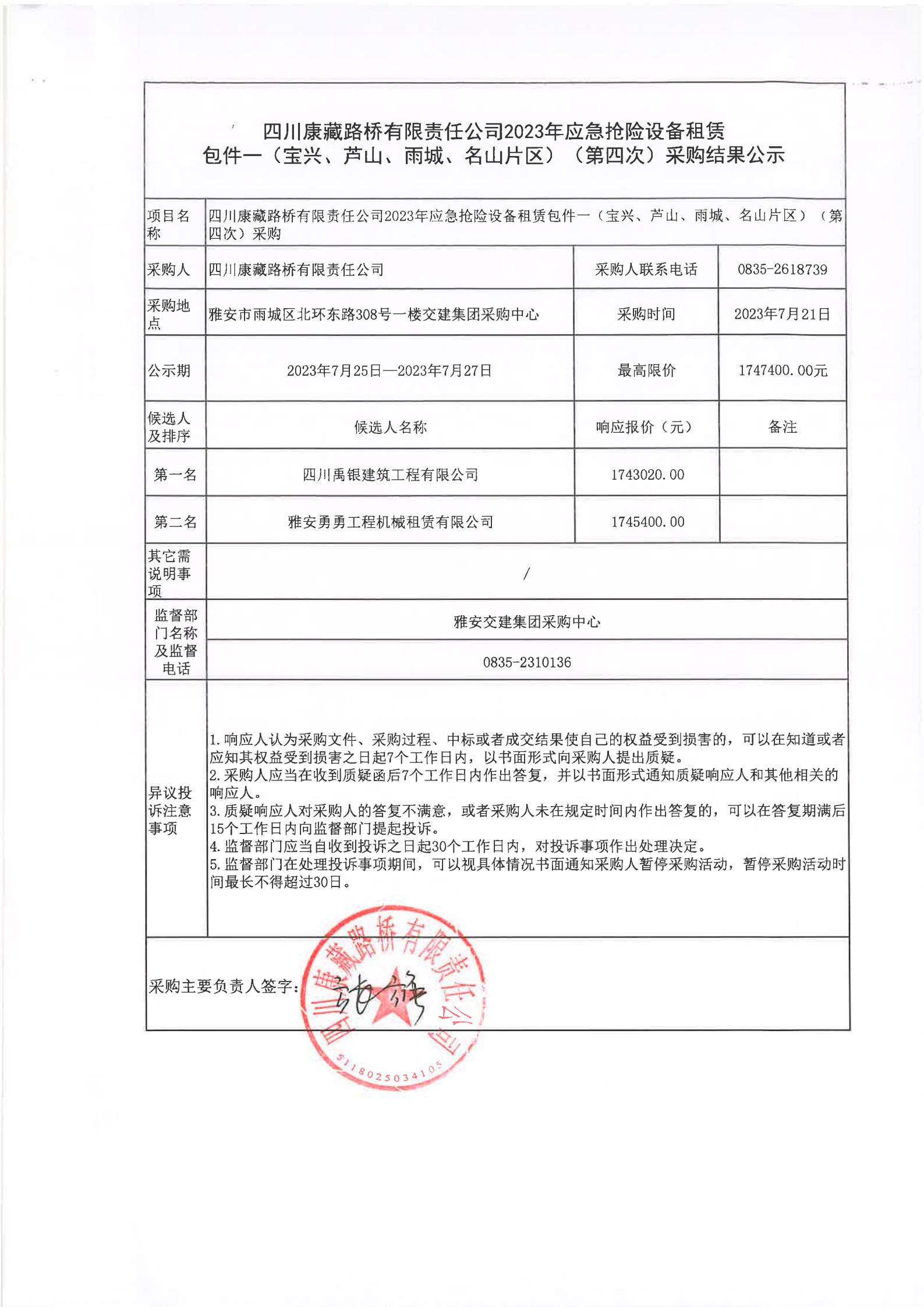 四川康藏路橋有限責(zé)任公司2023年應(yīng)急搶險(xiǎn)設(shè)備租賃包件一(寶興、蘆山、雨城、名山片區(qū))(第四次)采購結(jié)果公示