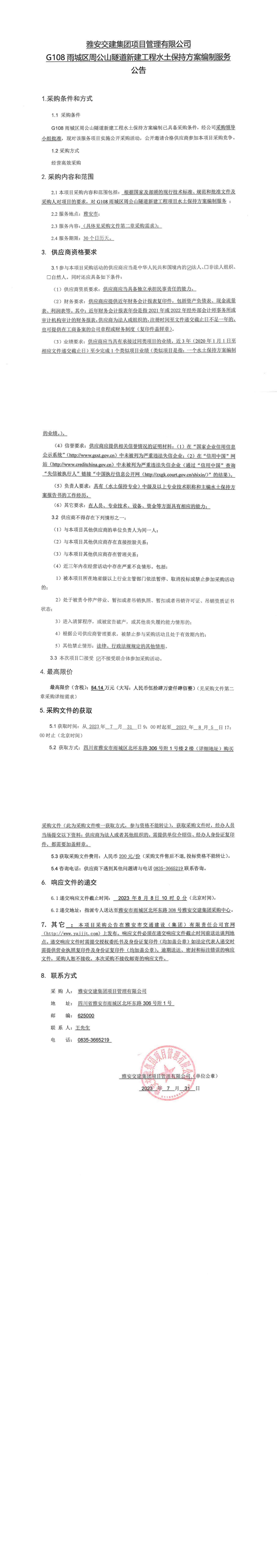 雅安交建集團項目管理有限公司G108雨城區(qū)周公山隧道新建工程水土保持方案編制服務公告