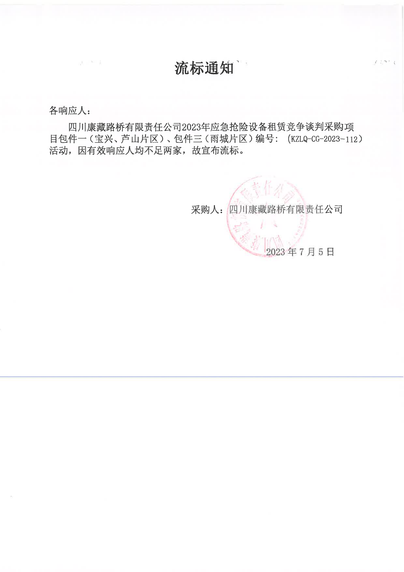 四川康藏路橋有限責(zé)任公司2023年應(yīng)急搶險(xiǎn)設(shè)備租賃競爭談判采購項(xiàng)目包件一(寶興、蘆山片區(qū))、包件三(雨城片區(qū))流標(biāo)通知
