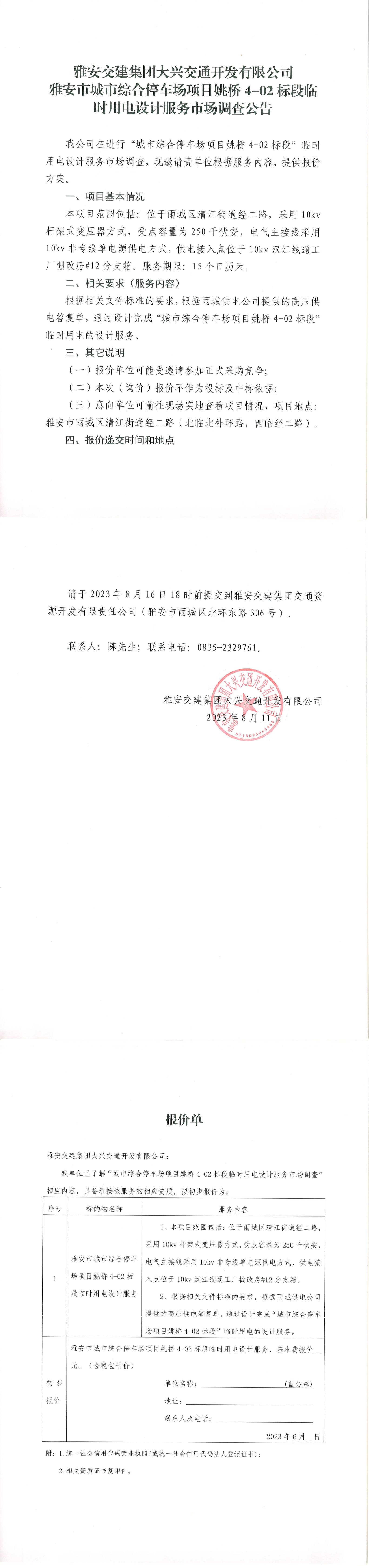 雅安交建集團大興交通開發(fā)有限公司雅安市城市綜合停車場項目姚橋4-02標段臨時用電設計服務市場調查公告