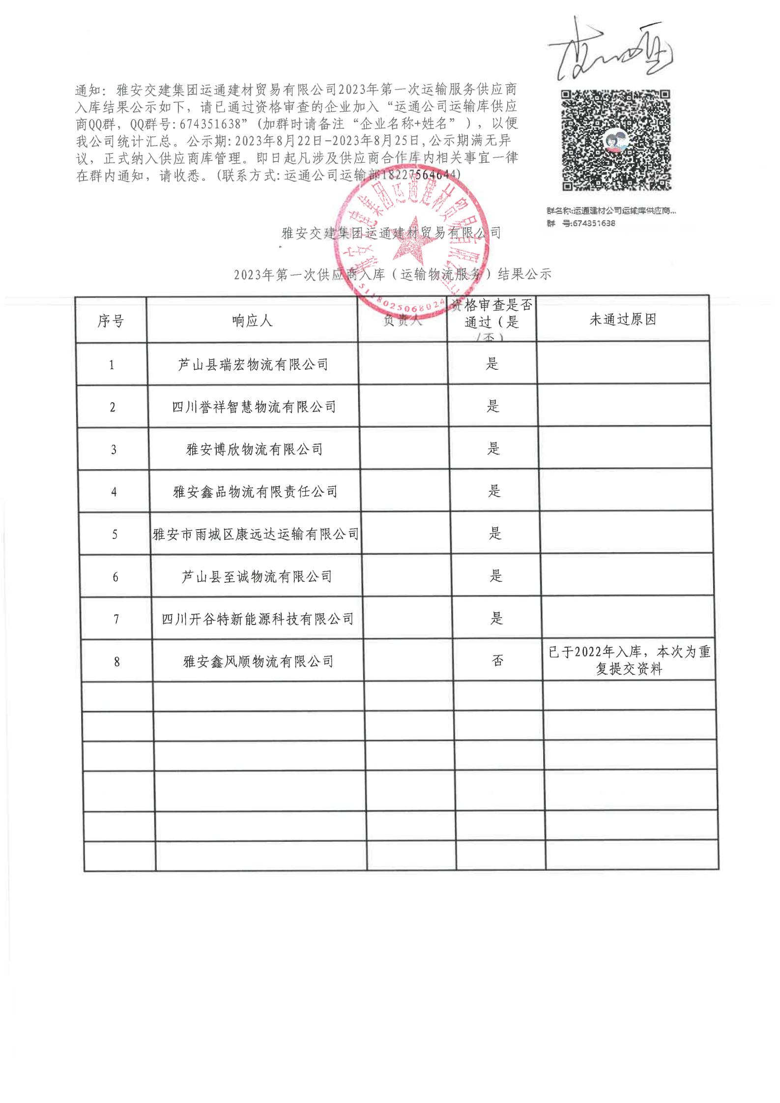 雅安交建集團(tuán)運(yùn)通建材貿(mào)易有限公司2023年第一次供應(yīng)商入庫(kù)(運(yùn)輸物流服務(wù))結(jié)果公示