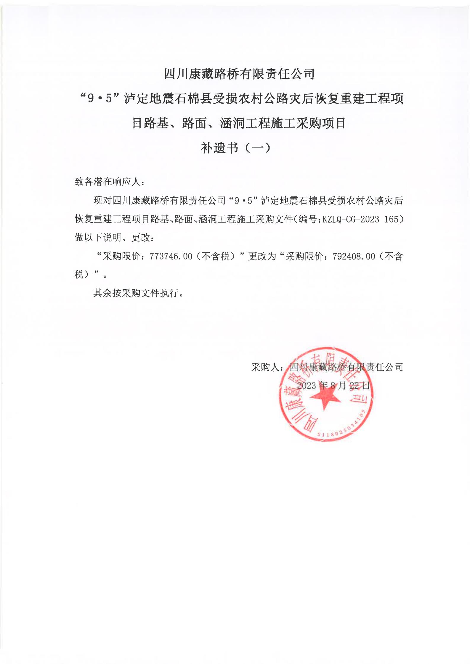 四川康藏路橋有限責(zé)任公司“9·5”瀘定地震石棉縣受損農(nóng)村公路災(zāi)后恢復(fù)重建工程項目路基、路面、涵洞工程施工采購項目補(bǔ)遺書(一)