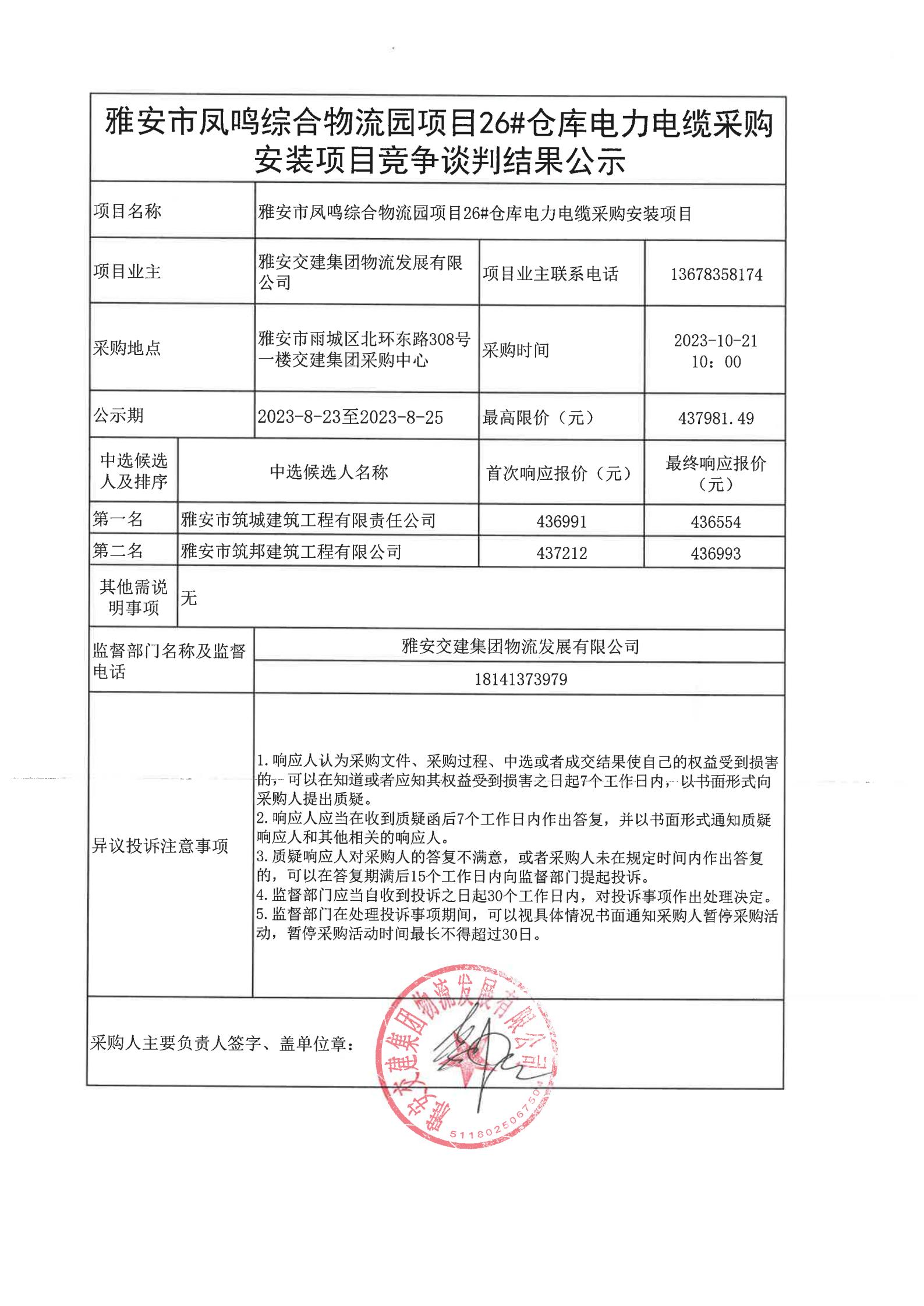 雅安交建集團(tuán)物流發(fā)展有限公司雅安市鳳鳴綜合物流園項(xiàng)目26#倉(cāng)庫(kù)電力電纜采購(gòu)安裝項(xiàng)目競(jìng)爭(zhēng)談判結(jié)果公示