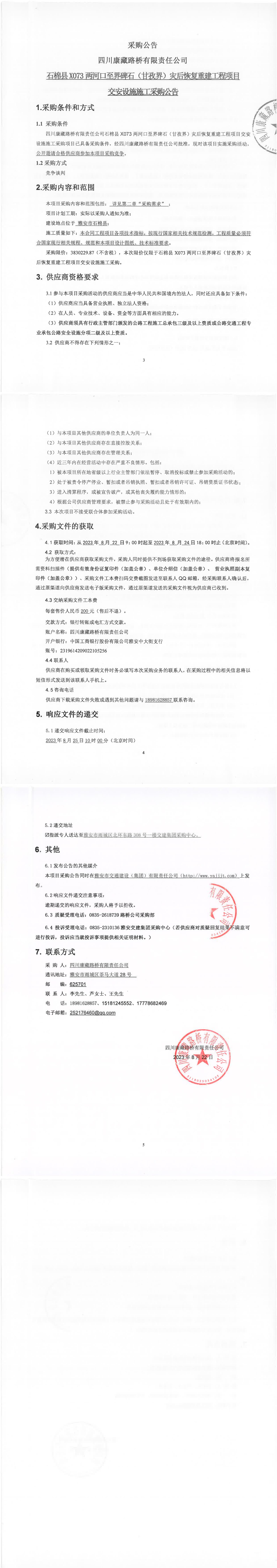 四川康藏路橋有限責任公司石棉縣X073兩河口至界碑石(甘孜界)災后恢復重建工程項目交安設(shè)施施工采購公告