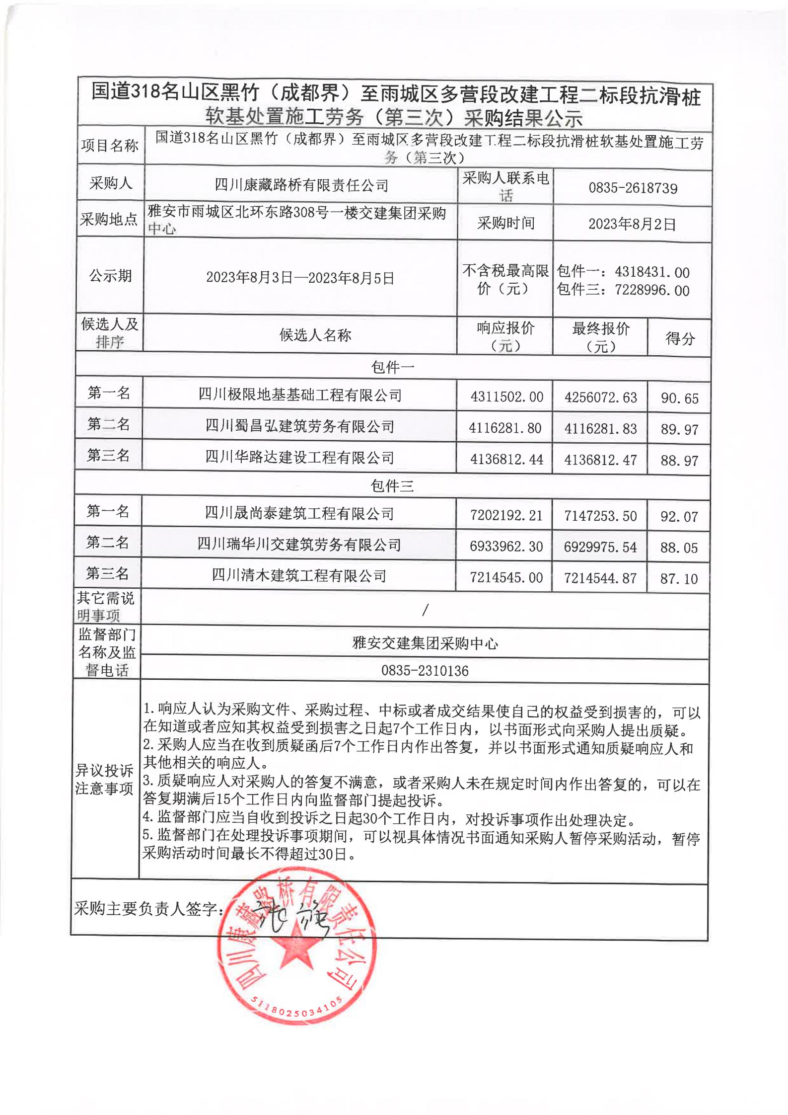 四川康藏路橋有限責(zé)任公司國道318名山區(qū)黑竹(成都界)至雨城區(qū)多營段改建工程二標段抗滑樁軟基處置施工勞務(wù)(第三次)采購結(jié)果公示