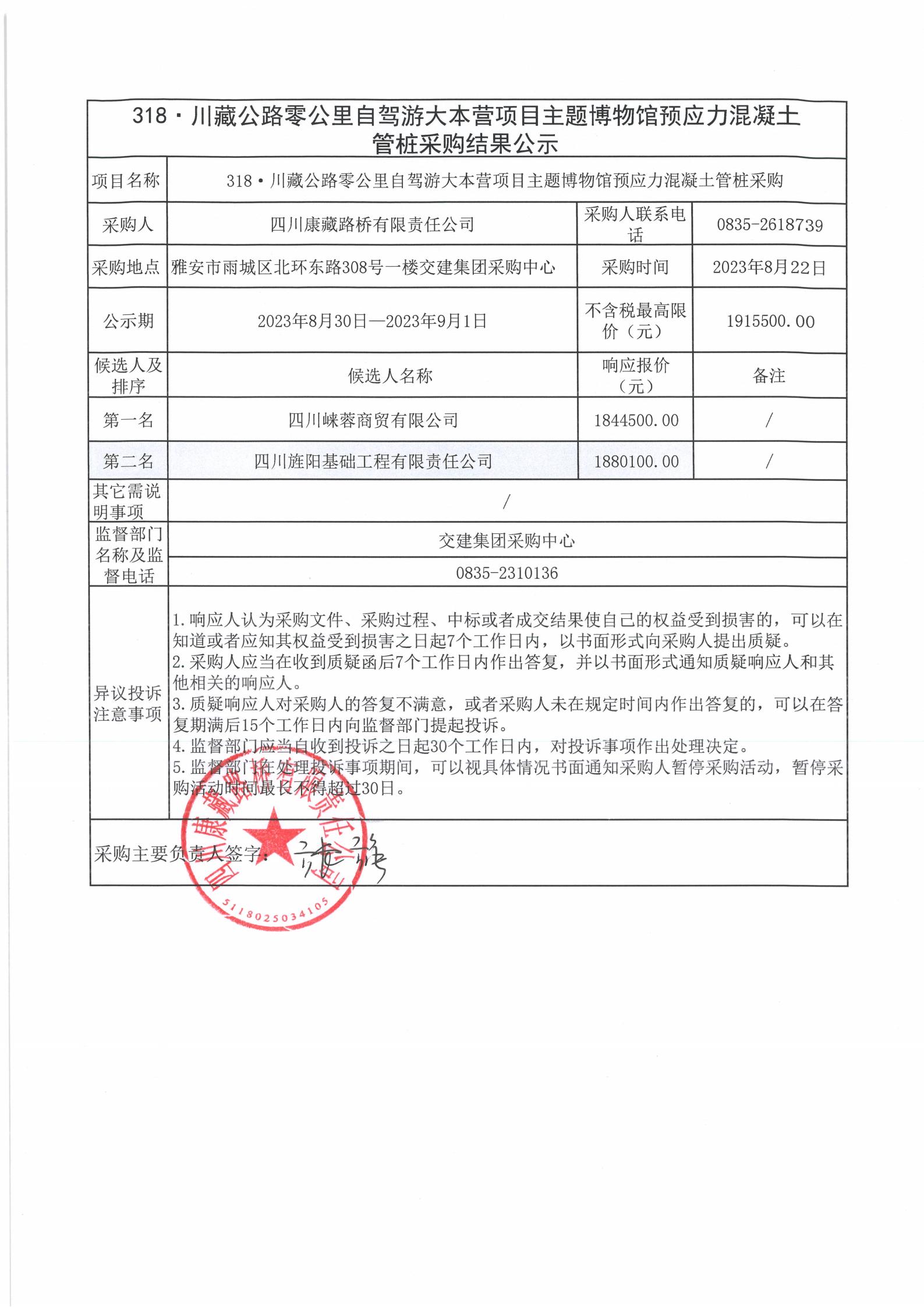 四川康藏路橋有限責(zé)任公司318·川藏公路零公里自駕游大本營項(xiàng)目主題博物館預(yù)應(yīng)力混凝土管樁采購結(jié)果公示