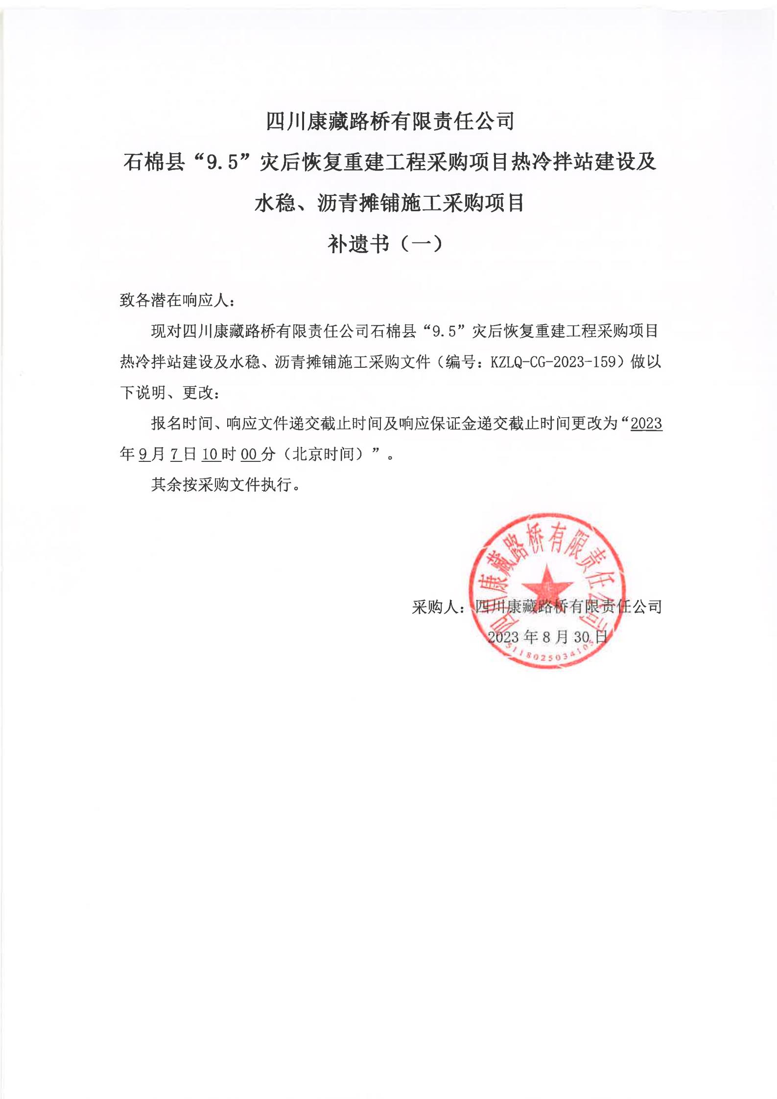 四川康藏路橋有限責任公司石棉縣“9·5”災(zāi)后恢復(fù)重建工程采購項目熱冷拌站建設(shè)及水穩(wěn)、瀝青攤鋪施工采購項目補遺書(一)