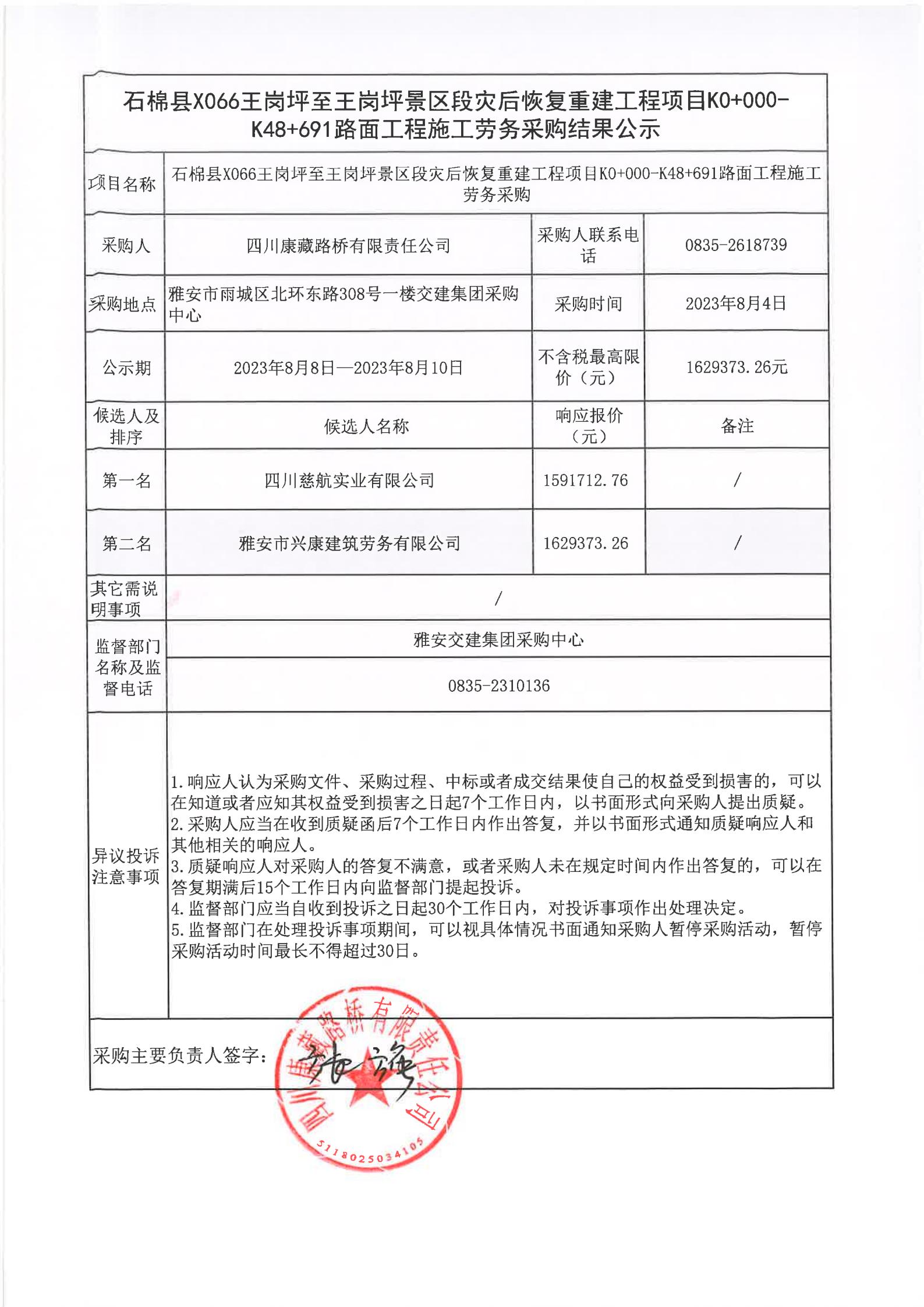 四川康藏路橋有限責任公司石棉縣X066王崗坪至王崗坪景區(qū)段災后恢復重建工程項目K0+000-K48+691路面工程施工勞務采購結果公示