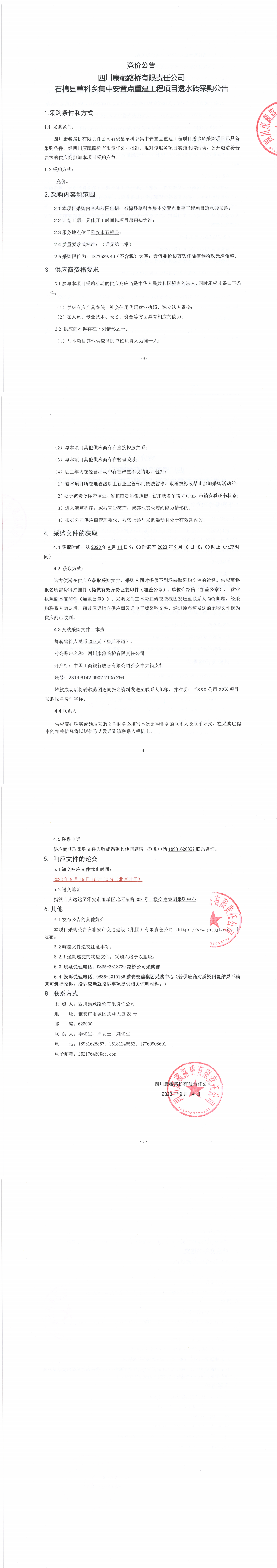 四川康藏路橋有限責(zé)任公司石棉縣草科鄉(xiāng)集中安置點重建工程項目透水磚采購公告