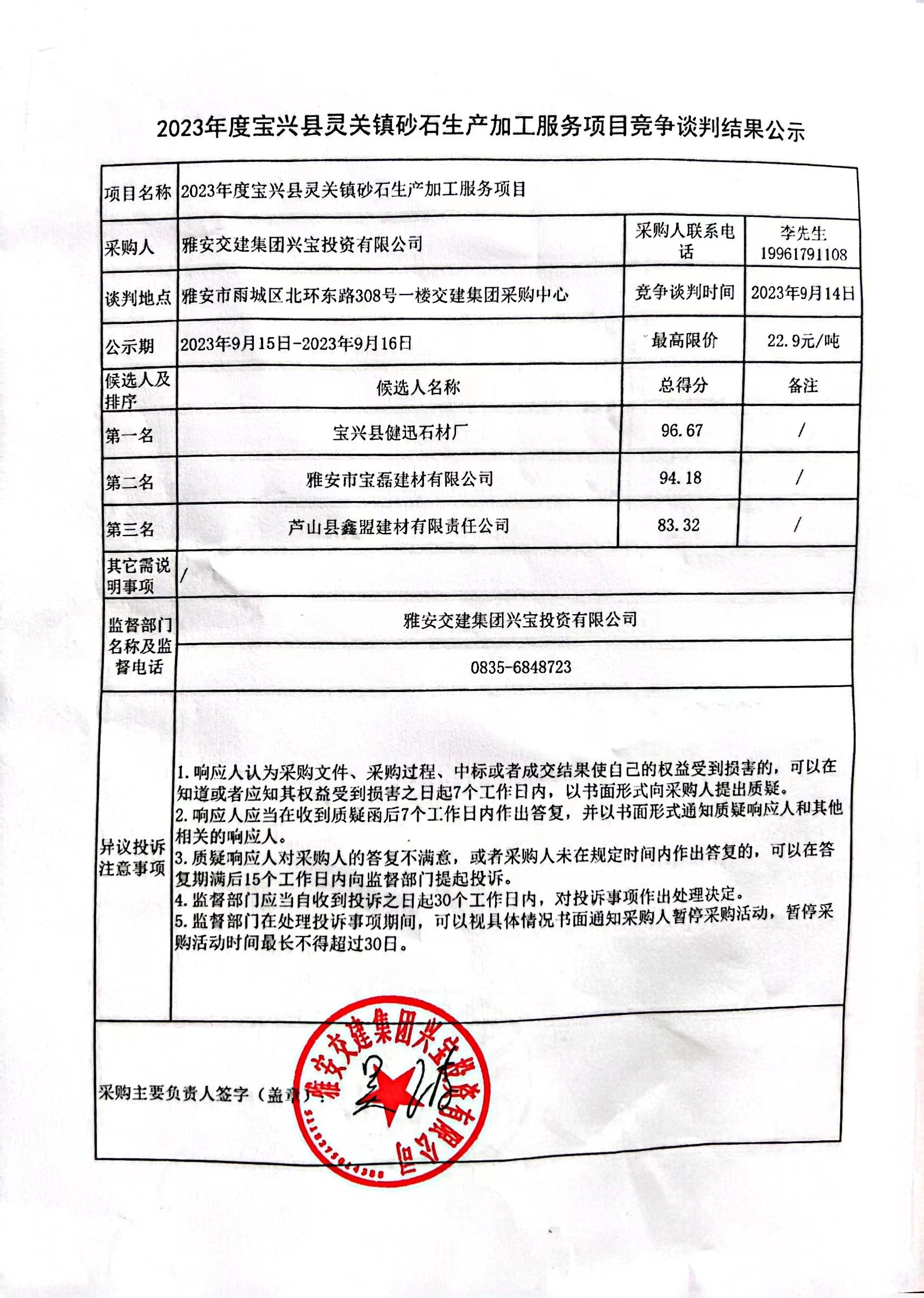 雅安交建集團興寶投資有限公司2023年度寶興縣靈關鎮(zhèn)砂石生產加工服務項目競爭談判結果公示