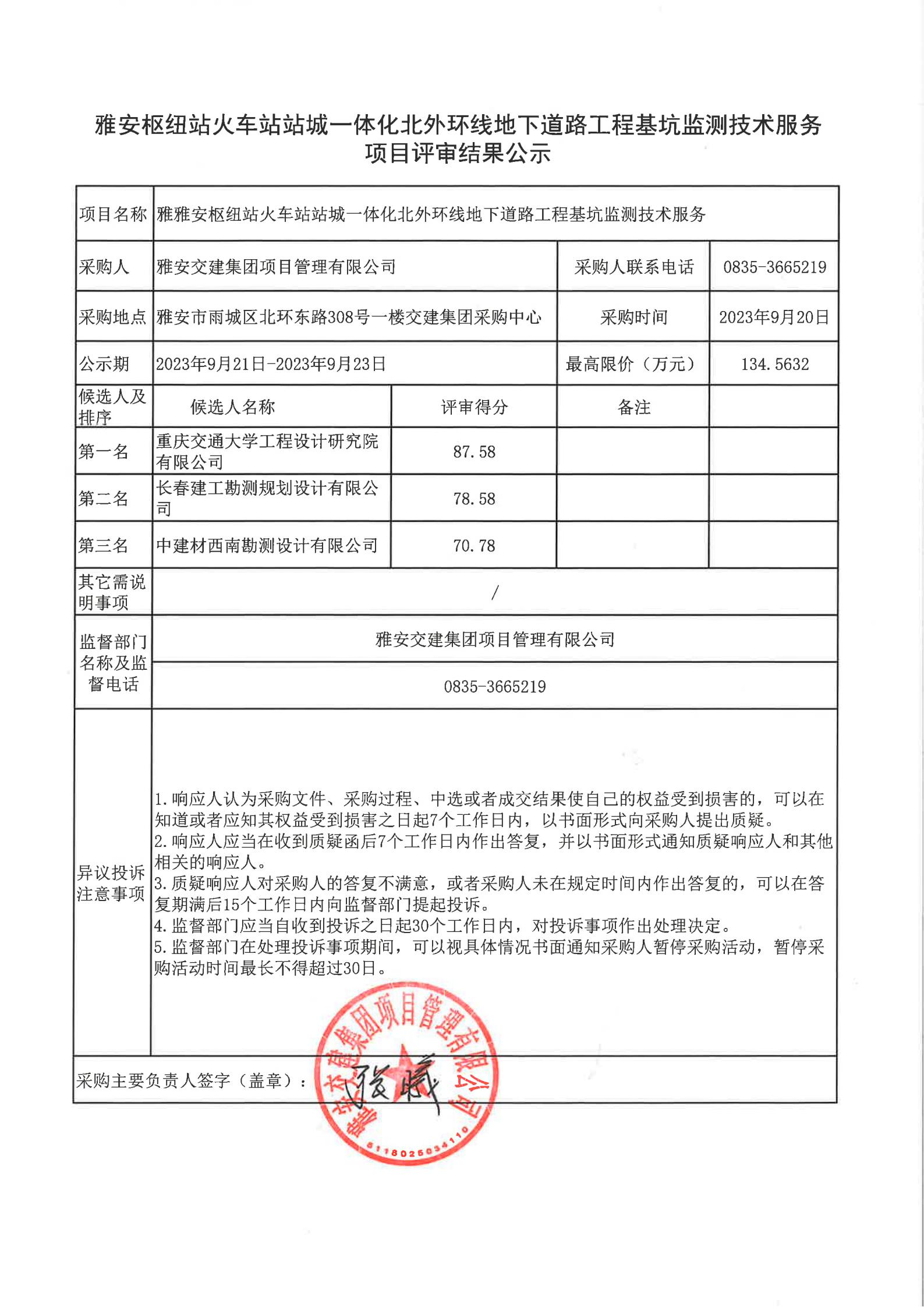 雅安交建集團項目管理有限公司雅安樞紐站火車站站城一體化北外環(huán)線地下道路工程基坑監(jiān)測技術(shù)服務項目評審結(jié)果公示