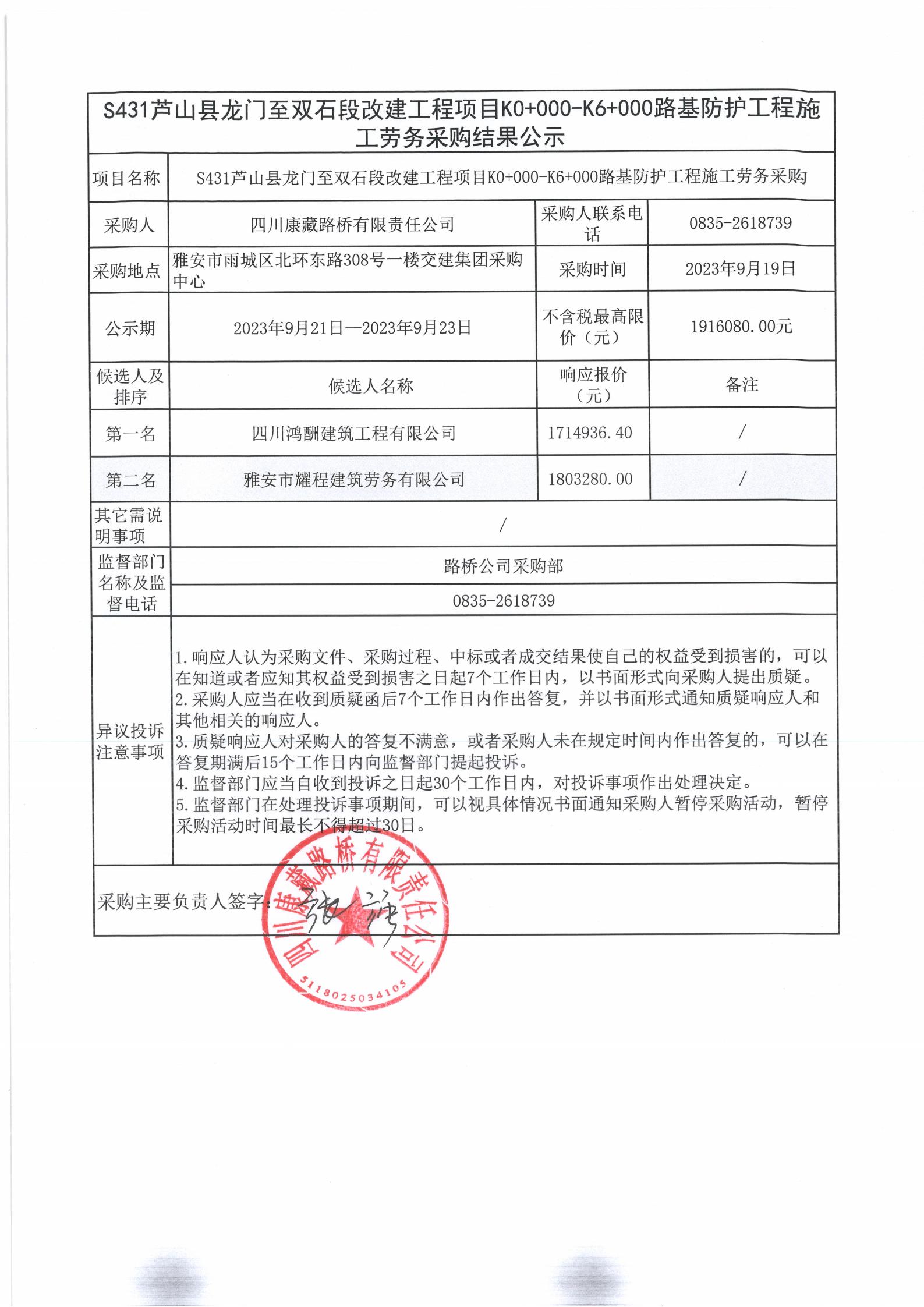 四川康藏路橋有限責任公司S431蘆山縣龍門至雙石段改建工程項目K0+000-K6+000路基防護工程施工勞務采購結果公示