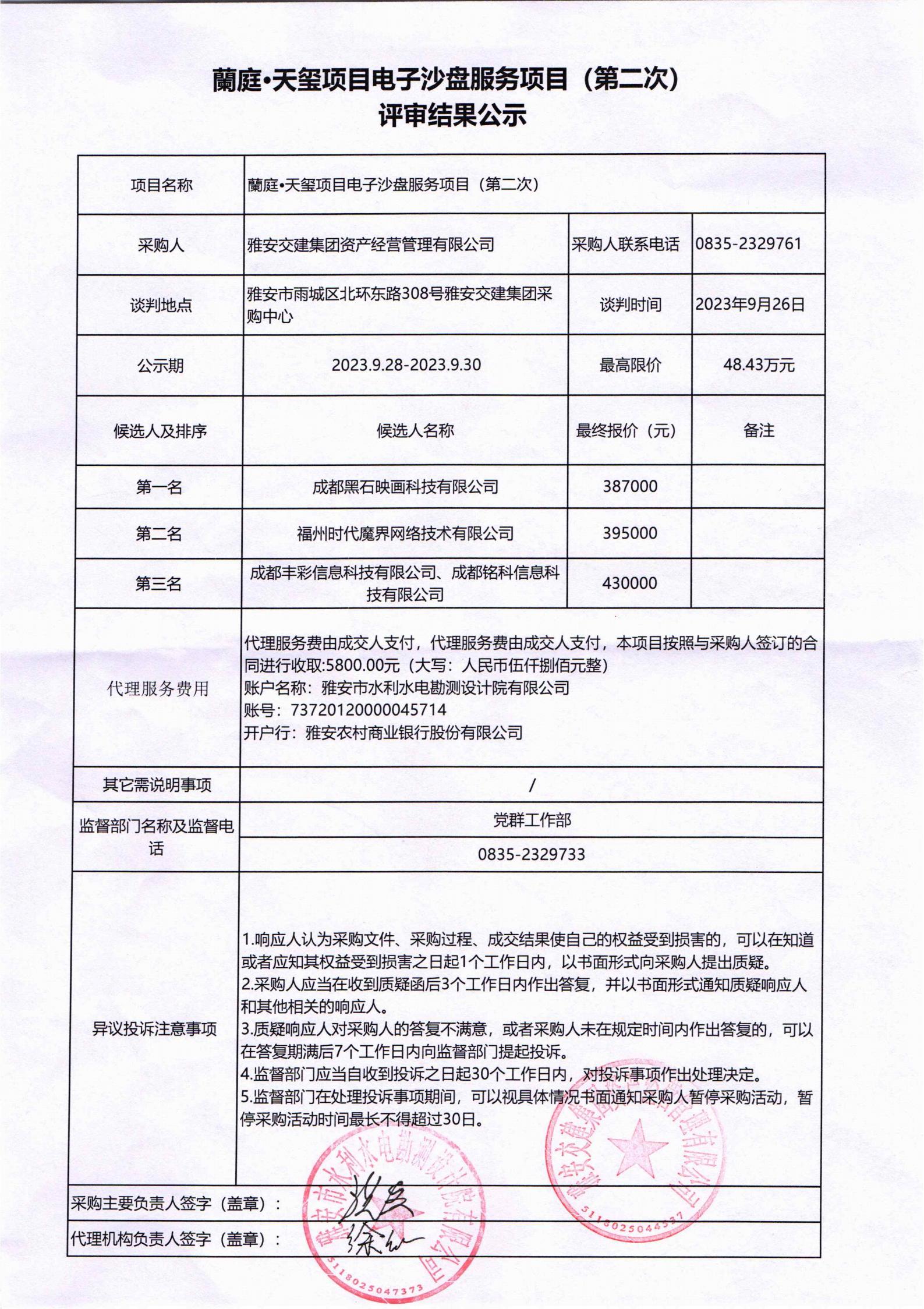 雅安交建集團資產經(jīng)營管理有限公司蘭庭•天璽項目電子沙盤服務項目(第二次)評審結果公示