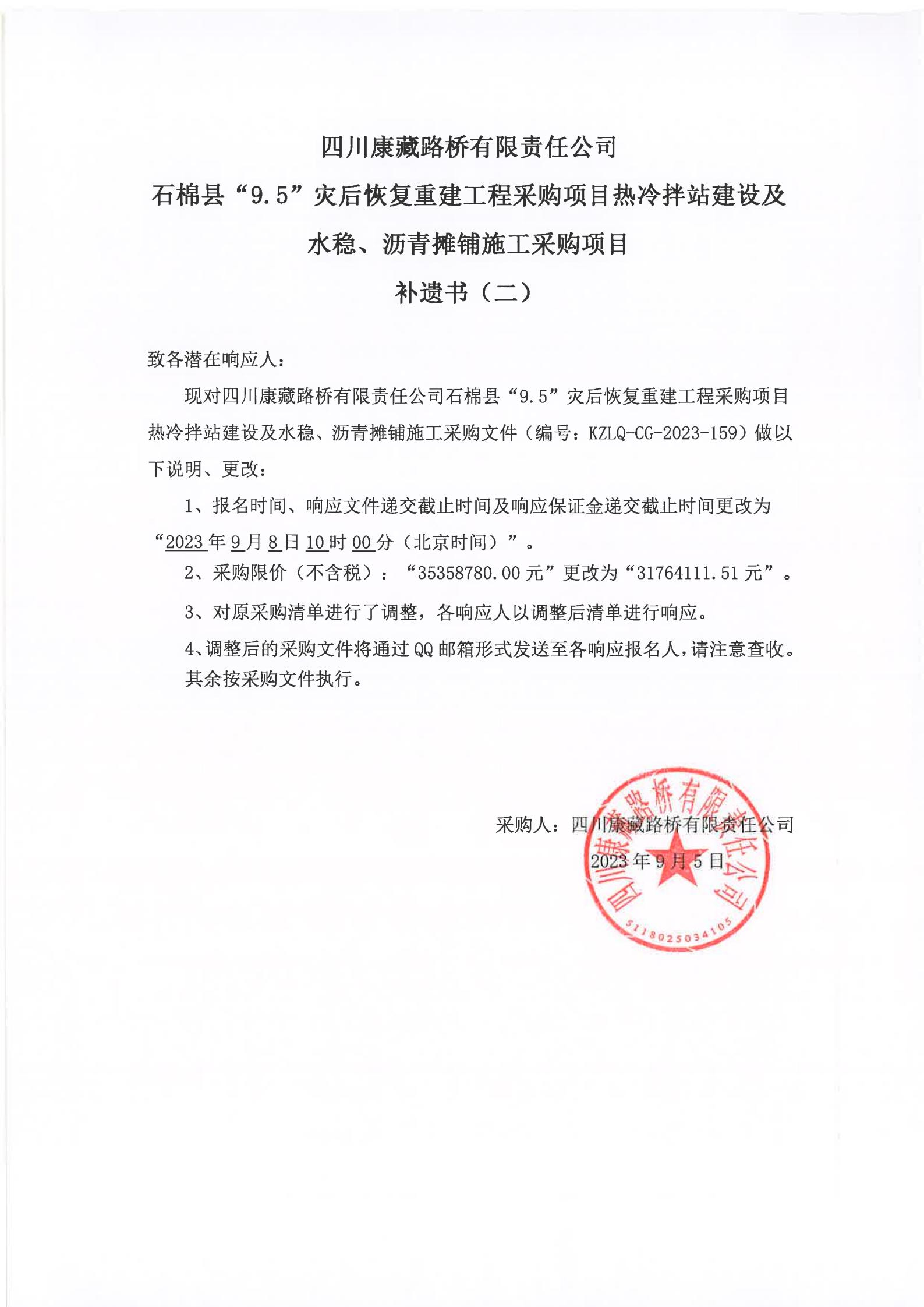 四川康藏路橋有限責(zé)任公司石棉縣“9·5”災(zāi)后恢復(fù)重建工程采購項目熱冷拌站建設(shè)及水穩(wěn)、瀝青攤鋪施工采購項目補(bǔ)遺書(二)
