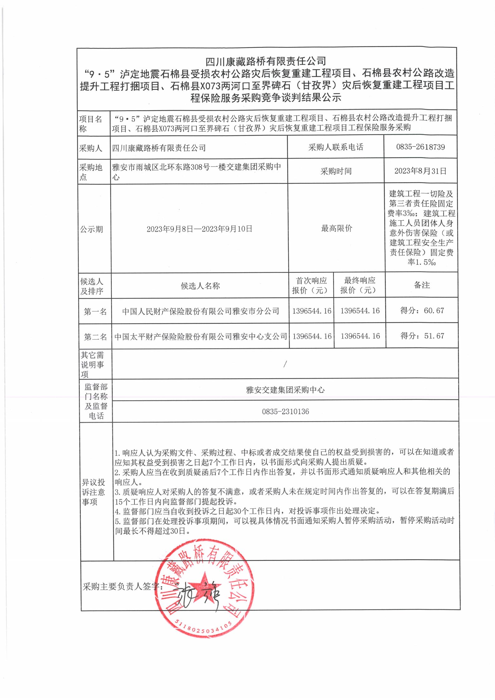 四川康藏路橋有限責(zé)任公司“9·5”瀘定地震石棉縣農(nóng)村公路災(zāi)后恢復(fù)重建工程項(xiàng)目、石棉縣農(nóng)村公路改造提升工程打捆項(xiàng)目、石棉縣X073兩河口至界碑石(甘孜界)災(zāi)后恢復(fù)重建工程項(xiàng)目工程保險(xiǎn)服務(wù)采購競(jìng)爭(zhēng)談判結(jié)果公示