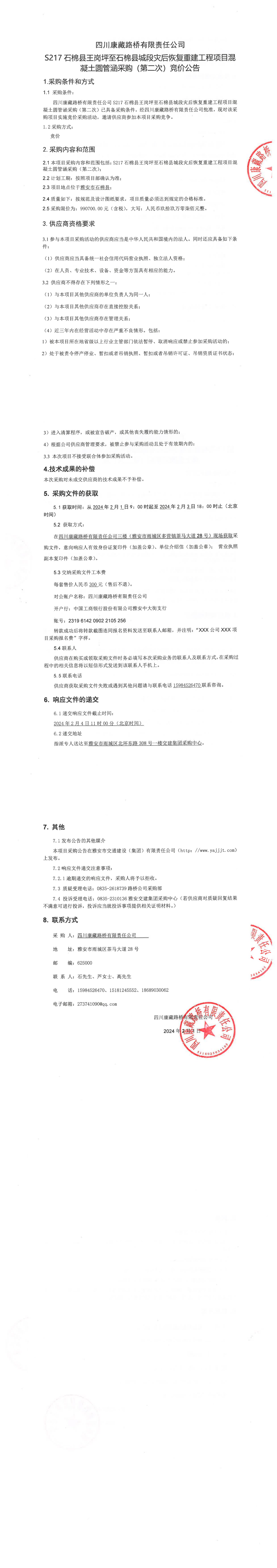 四川康藏路橋有限責(zé)任公司S217石棉縣王崗坪至石棉縣城段災(zāi)后恢復(fù)重建工程項目混凝土圓管涵采購(第二次)競價公告