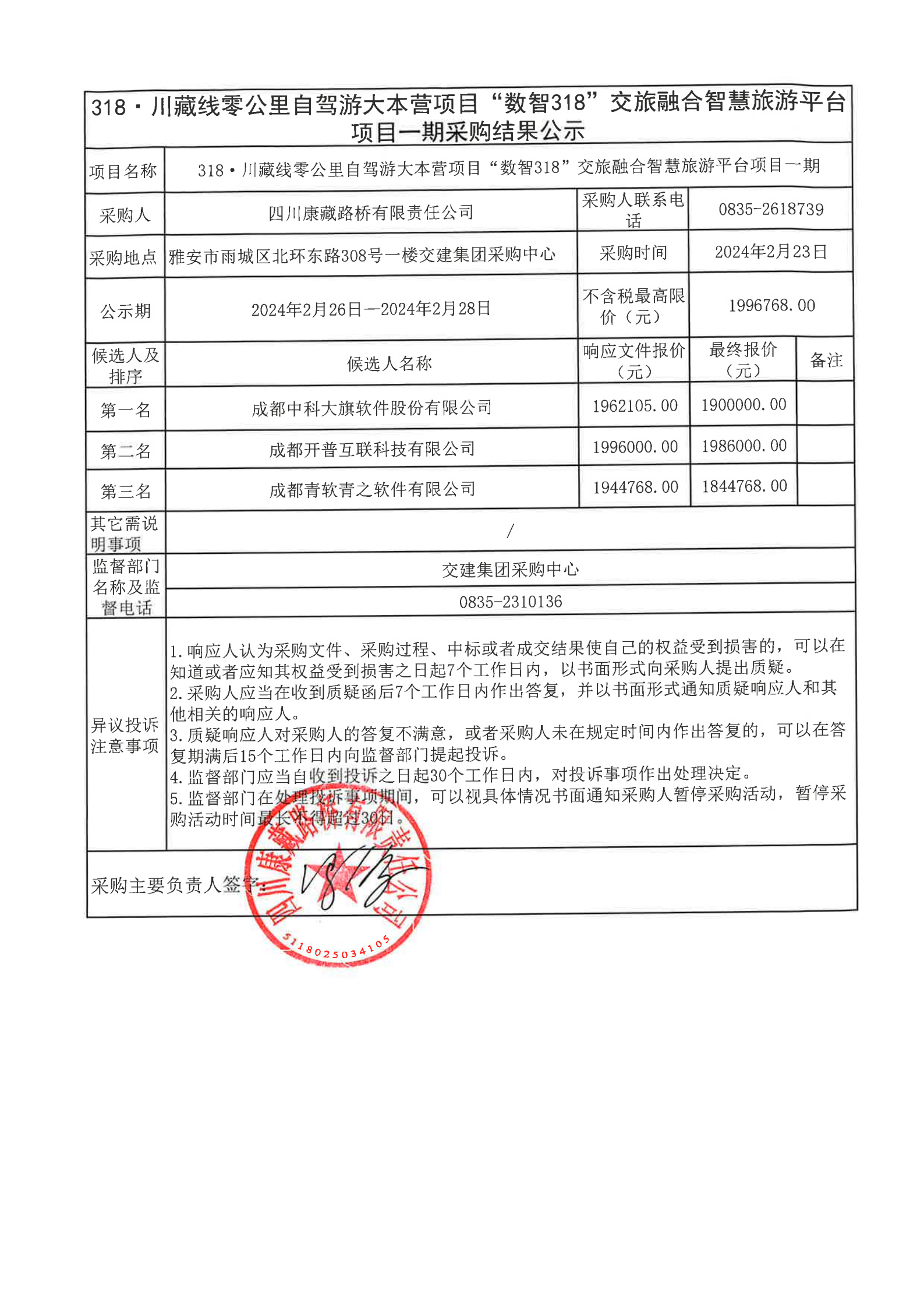 四川康藏路橋有限責(zé)任公司318·川藏公路零公里自駕游大本營項目“數(shù)智318”交旅融合智慧旅游平臺項目一期采購結(jié)果公示