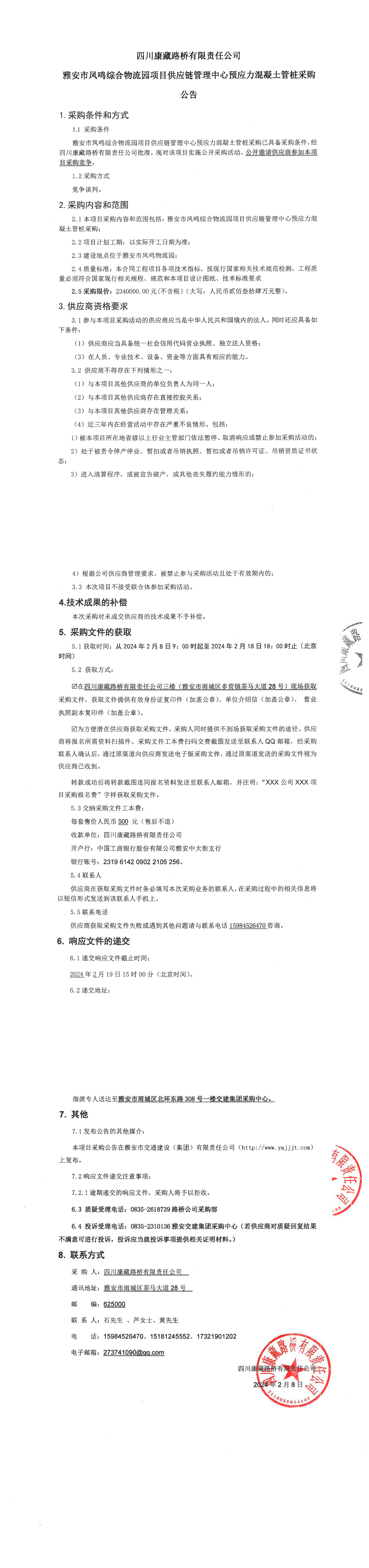 四川康藏路橋有限責(zé)任公司雅安市鳳鳴綜合物流園項(xiàng)目供應(yīng)鏈管理中心預(yù)應(yīng)力混凝土管樁采購(gòu)公告