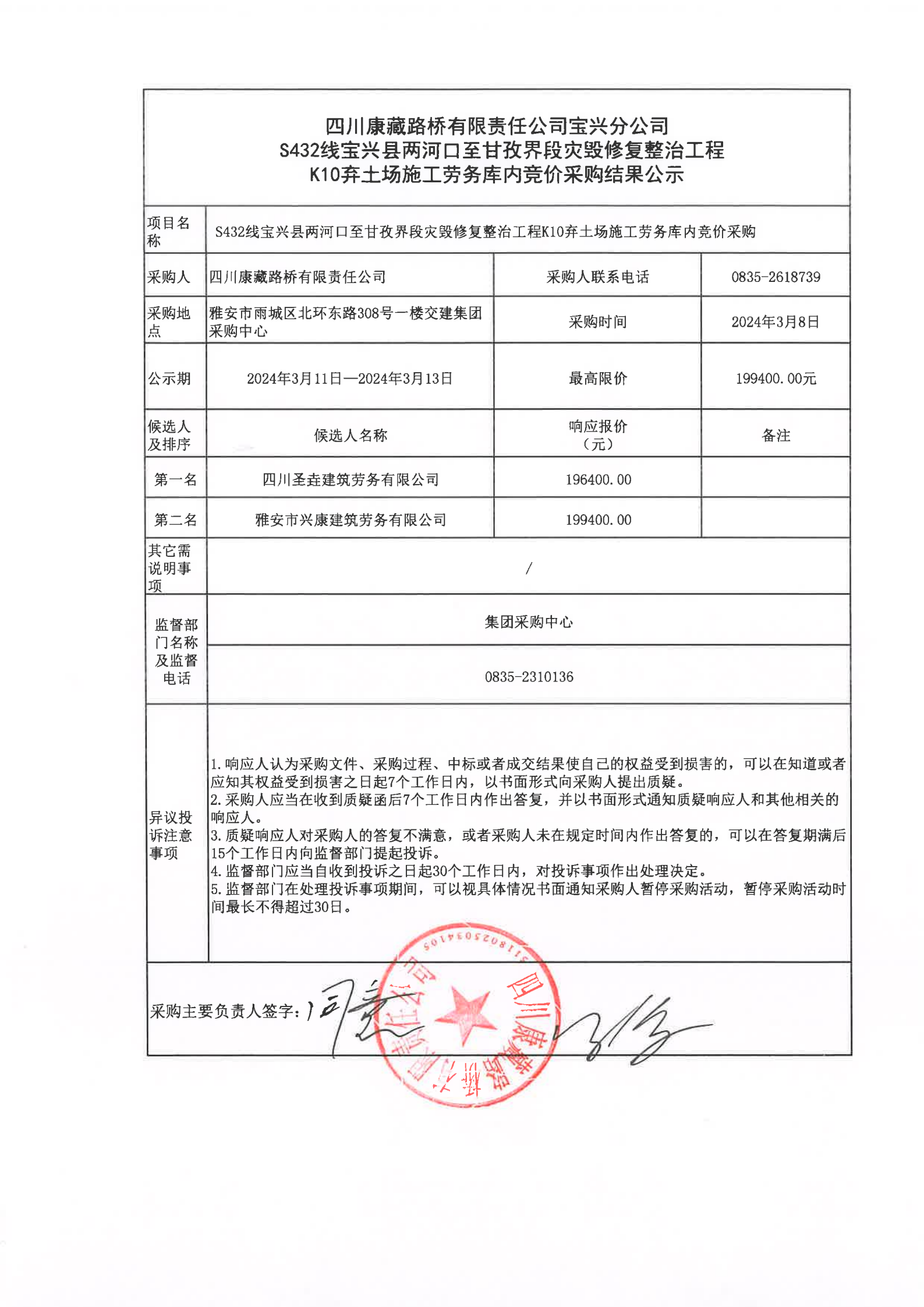 四川康藏路橋有限責任公司寶興分公司S432線寶興縣兩河口至甘孜界段災毀修復整治工程K10棄土場施工勞務庫內(nèi)采購結果公示