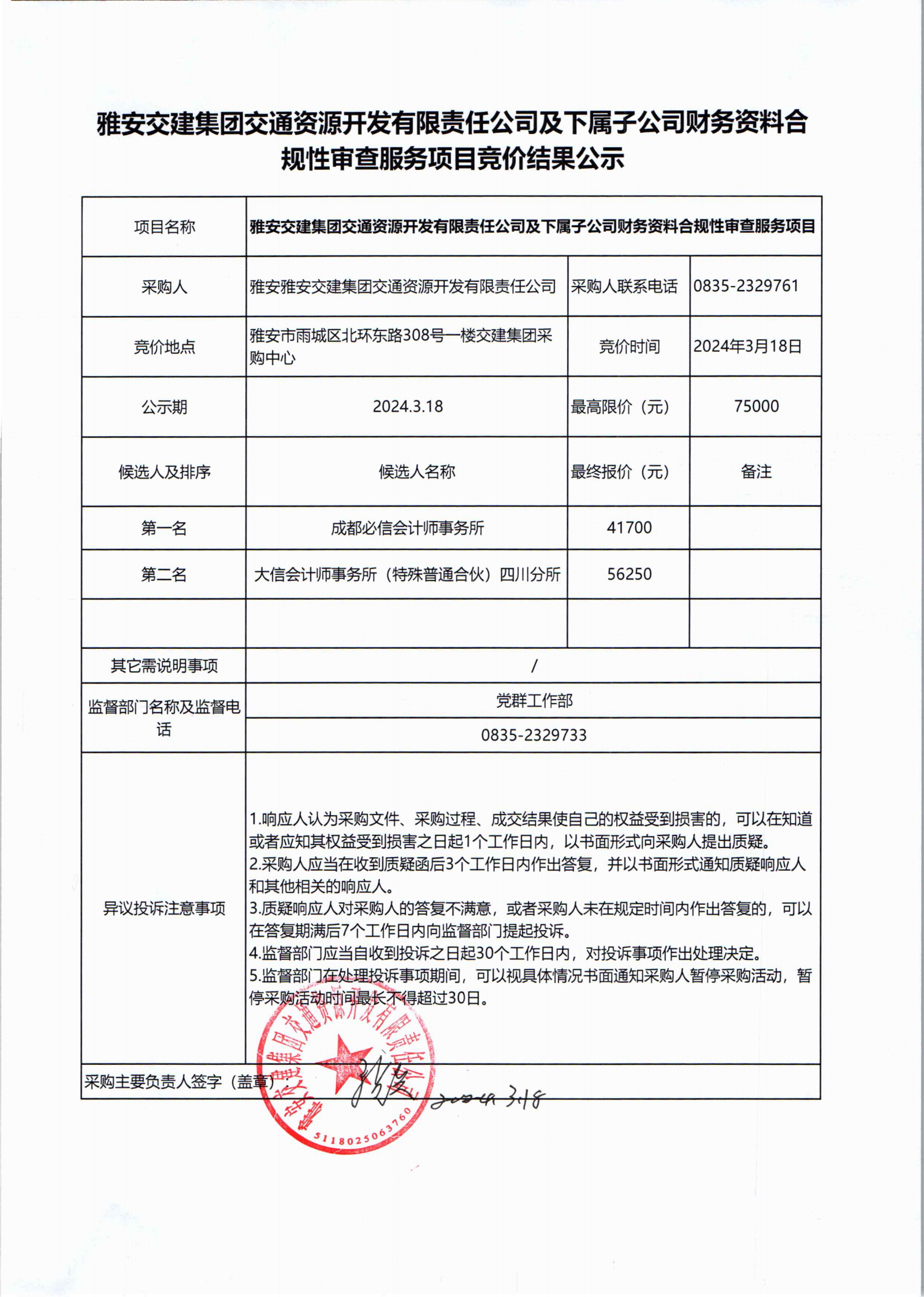 雅安交建集團(tuán)交通資源開(kāi)發(fā)有限責(zé)任公司及下屬子公司財(cái)務(wù)資料合規(guī)性審查服務(wù)項(xiàng)目競(jìng)價(jià)結(jié)果公示