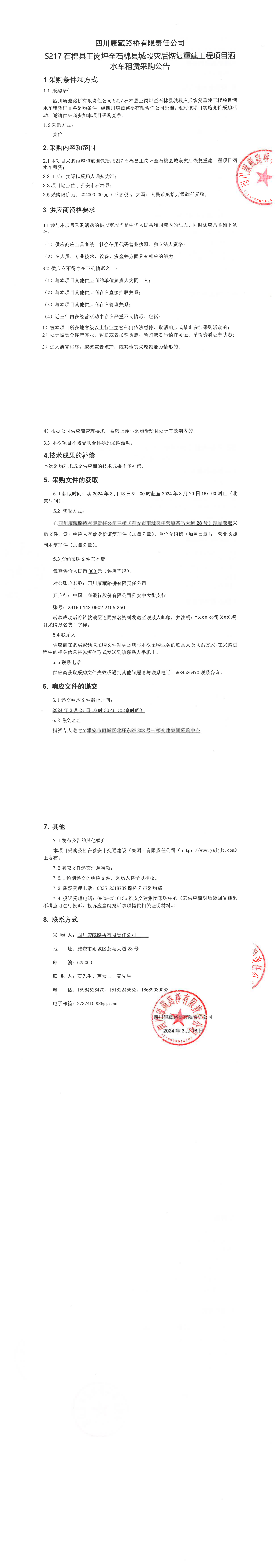 四川康藏路橋有限責(zé)任公司S217石棉縣王崗坪至石棉縣城段災(zāi)后恢復(fù)重建工程項(xiàng)目灑水車(chē)租賃采購(gòu)公告