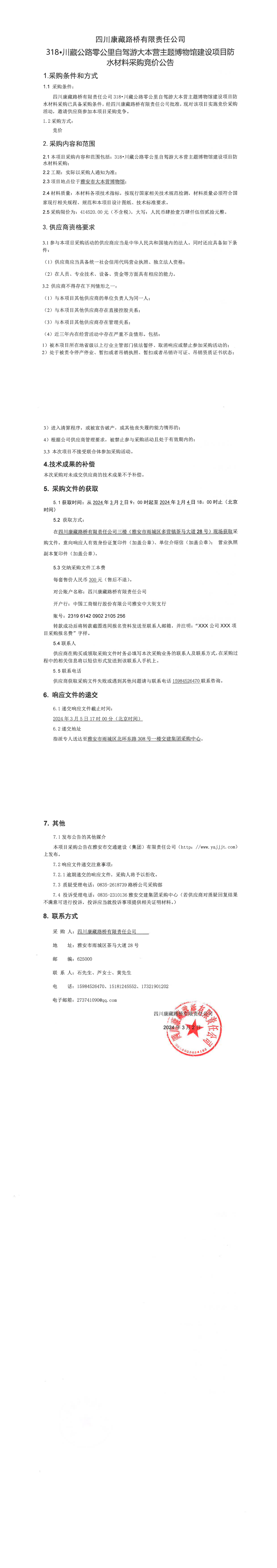 四川康藏路橋有限責(zé)任公司318·川藏公路零公里自駕游大本營主題博物館建設(shè)項(xiàng)目防水材料采購競價(jià)公告